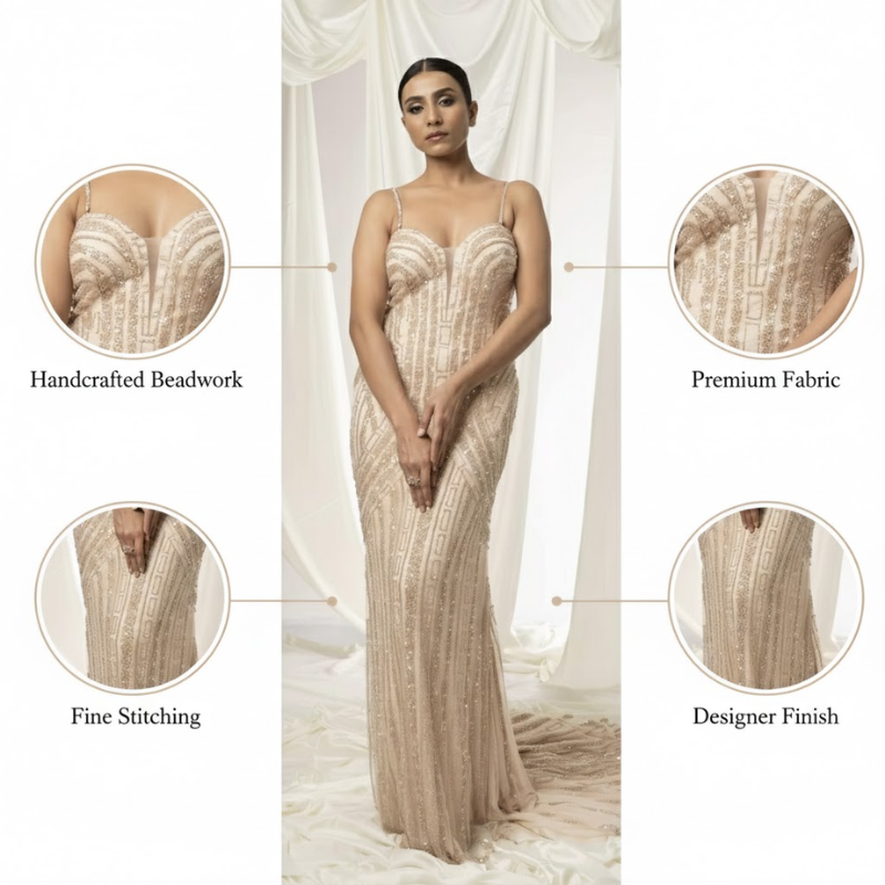 ชุดราตรียาวหรูหราสำหรับผู้หญิงพร้อมผ้าตาข่าย | ชุดเดรสเรียบหรูระดับพรีเมียมสำหรับงานเลี้ยงอาหารค่ำ งานแต่งงาน และงานพิเศษ