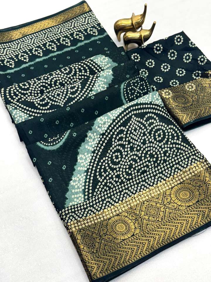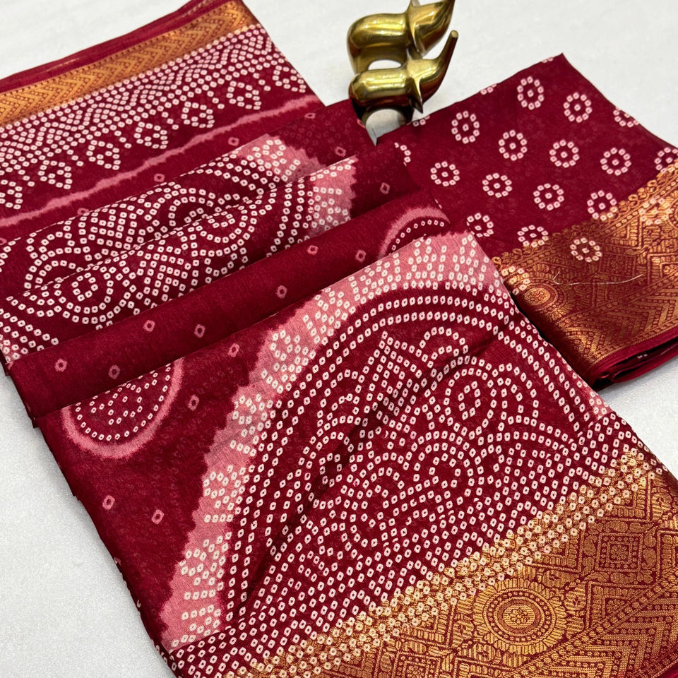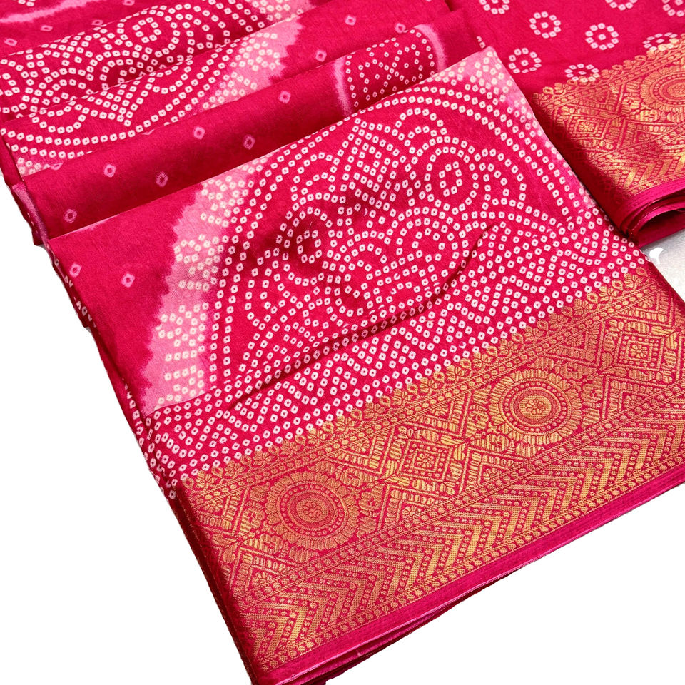 ผ้าส่าหรีไหมเนื้อนุ่มคุณภาพพรีเมียมสำหรับผู้หญิง ลายแจ็คการ์ด โดลา งานแฮนด์เมดทั้งหมด ลายบันดานี พร้อมดีไซน์แจ็คการ์ดหนักแน่น ผลิตในอินเดีย