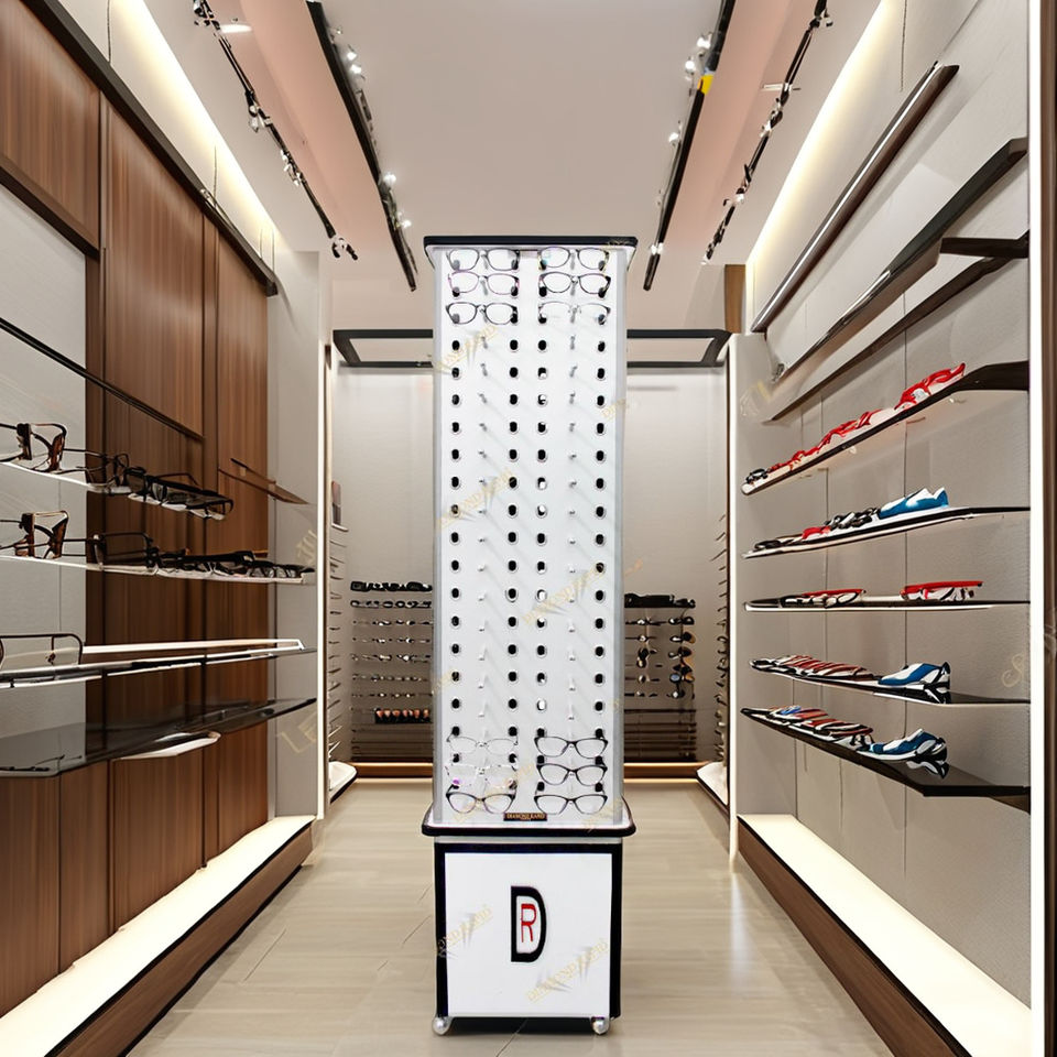ขาตั้งแบบหมุนสำหรับตั้งพื้นจอแสดงผลออปติคอลทำจากไม้ดีไซน์แบบหมุนได้พร้อมก้านล็อคสำหรับร้านค้าออปติก