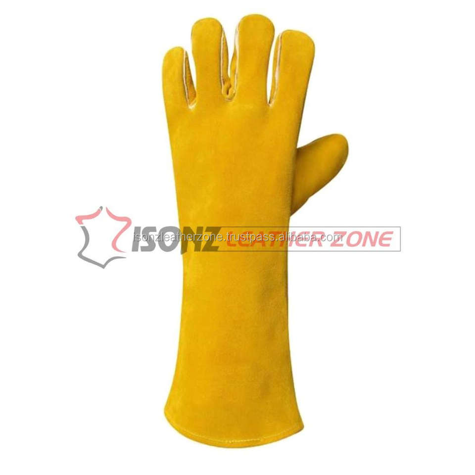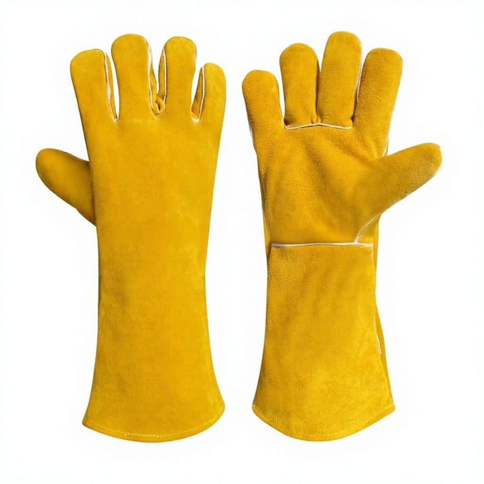 ถุงมือเชื่อมเหลืองคุณภาพพรีเมียม ถุงมือปิ้งย่าง ถุงมือบาร์บีคิว หนังวัวแท้ 14 นิ้ว บุซับใน ป้องกันความร้อน ทนทาน ป้องกันการบาด