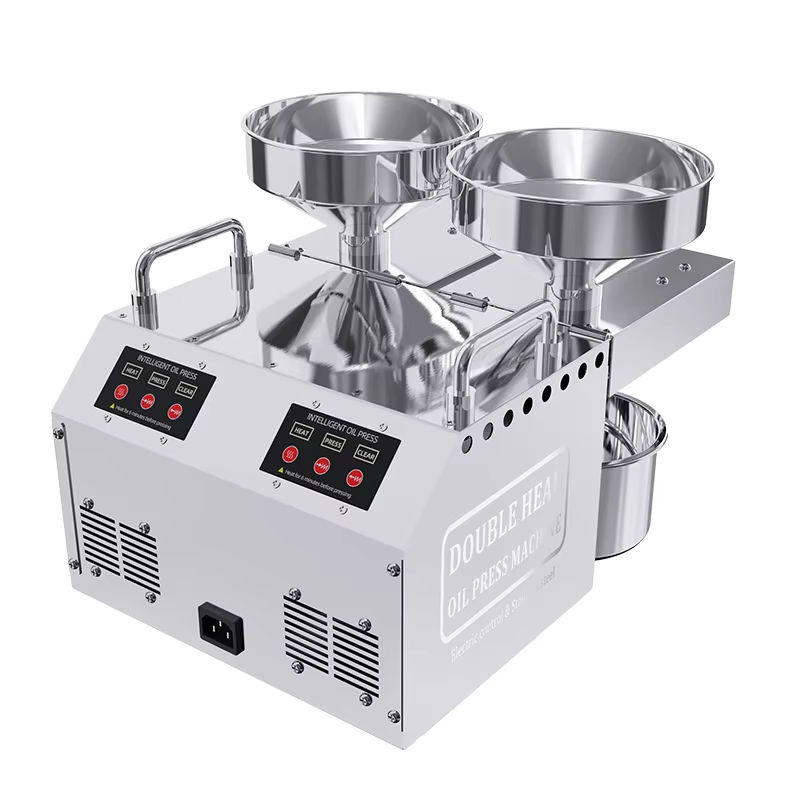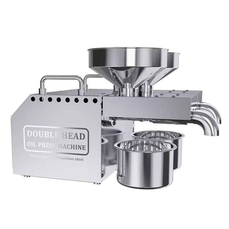 เครื่องกดน้ำมันสองหัวแบบคุณภาพระดับพรีเมี่ยมและติดทนนานพร้อมตัวเครื่องสแตนเลสและการออกแบบที่กะทัดรัดเพื่อง่ายต่อการจัดเก็บ