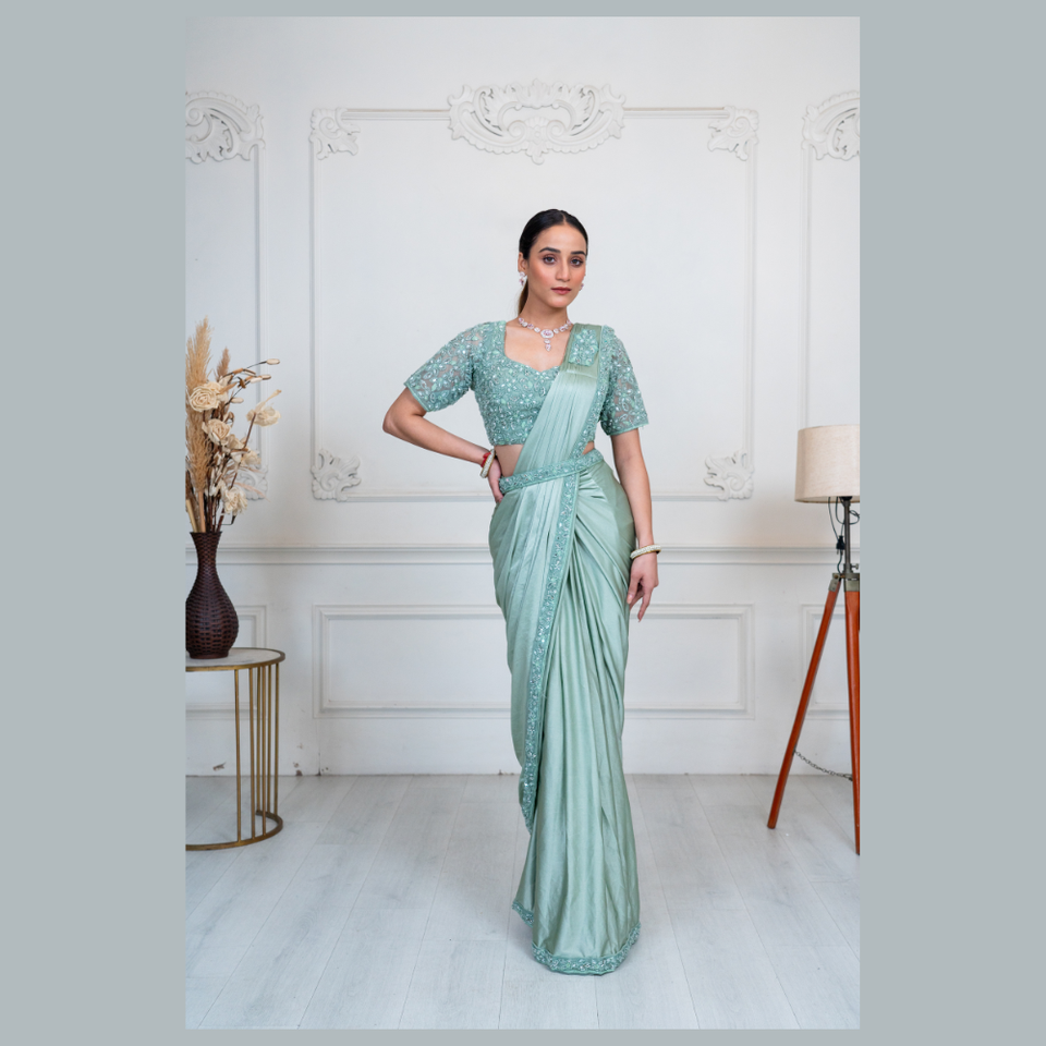 ชุดส่าหรีสีเขียวปีสต้าพร้อมงานสัมผัสประณีตสำหรับปริมาณมากจากอินเดียในราคาขายส่ง