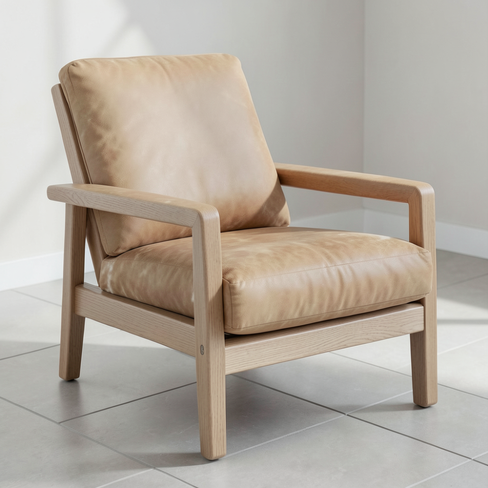 เก้าอี้พักผ่อนหนังวัวแท้พรีเมียมพร้อมโครงไม้เนื้อแข็ง เก้าอี้หุ้มหนังวัวแท้สไตล์โมเดิร์นสำหรับห้องนั่งเล่น