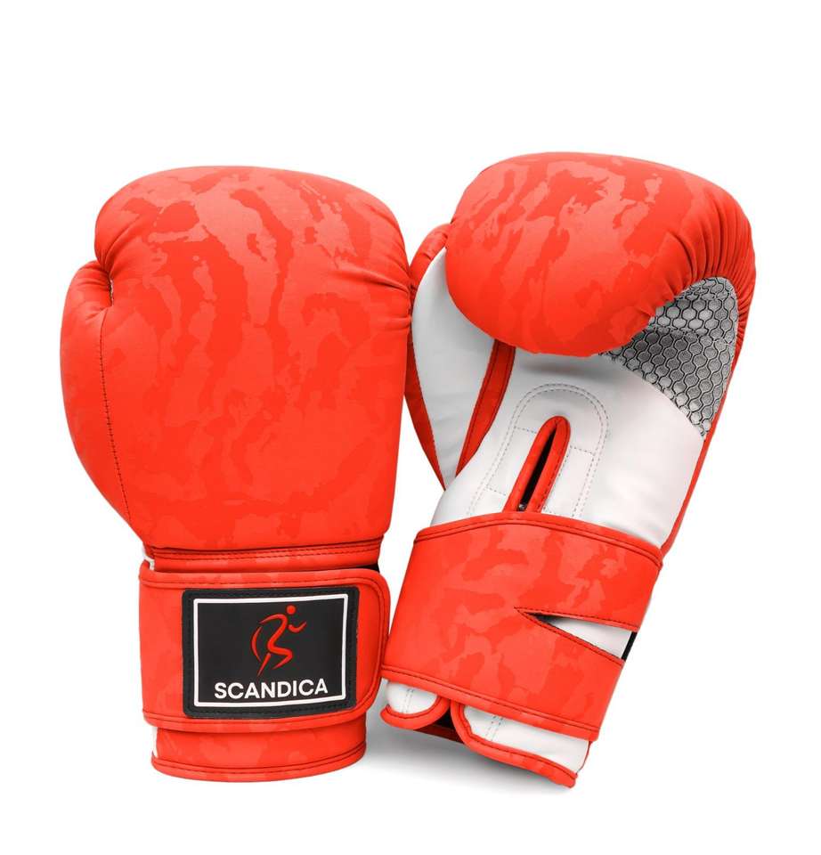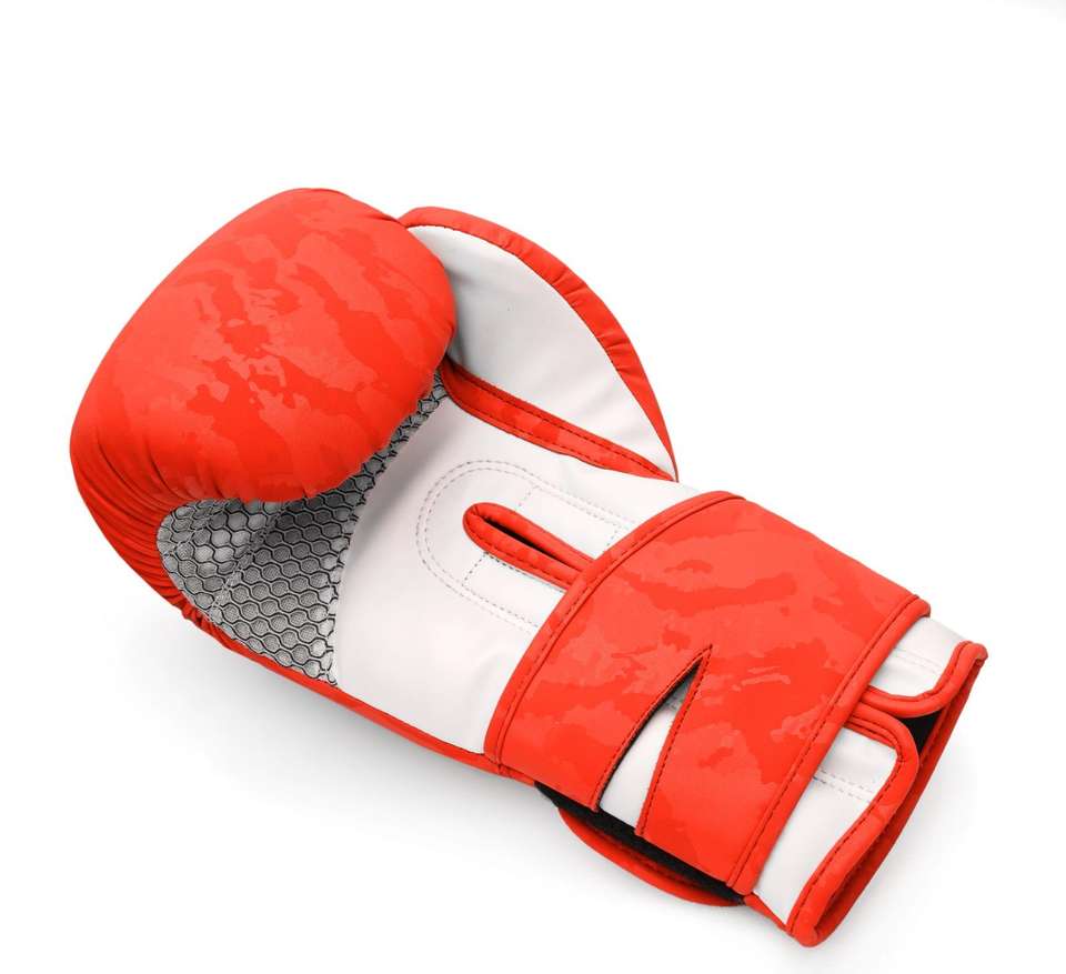 ถุงมือมวยลายพรางสีแดงทำจากหนังสังเคราะห์ที่ทนทานพร้อมสายรัดข้อมือที่แข็งแรงรองรับพลังความสะดวกสบาย