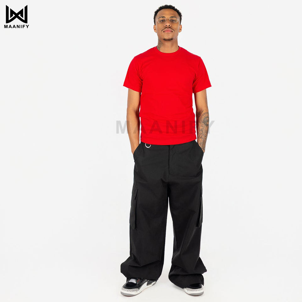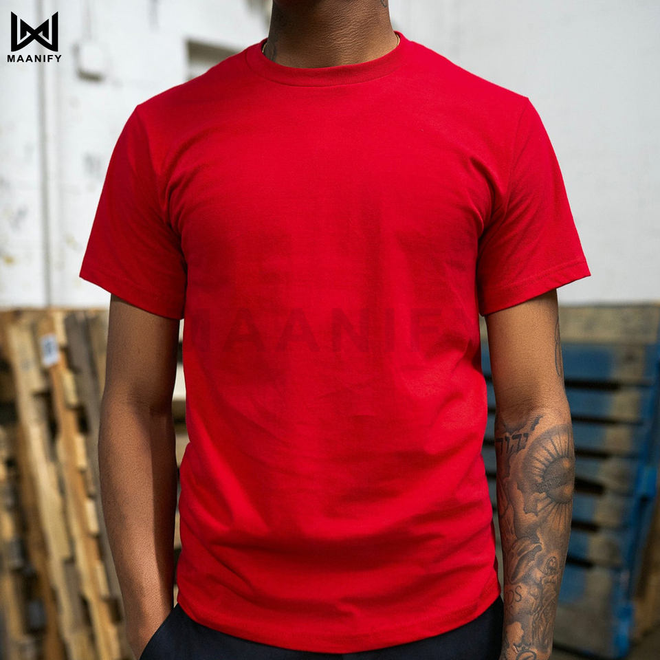 เสื้อยืดโอเวอร์ไซส์สีแดงพรีเมียมสำหรับผู้ชาย สไตล์สตรีทแวร์ทรงหลวม ผ้าคอตตอนหวีพิเศษ ย้อมสีสำเร็จรูป รับทำโลโก้ตามสั่ง โรงงาน OEM MAANIFY