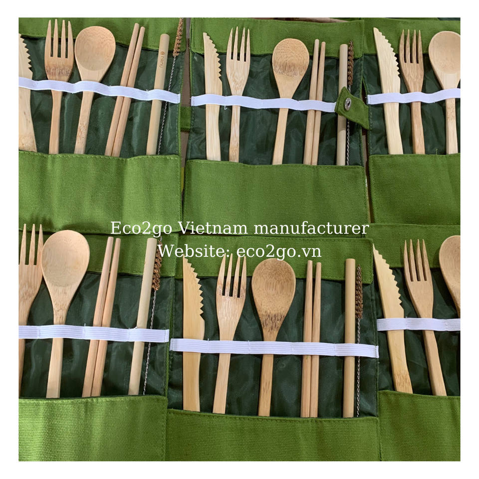 ชุดช้อนส้อมทำจากไม้ไผ่ใช้ซ้ำได้สำหรับงานแต่งงานสามารถแกะสลักโลโก้และบรรจุภัณฑ์ด้วยถุงผ้าใบ ECO2GO