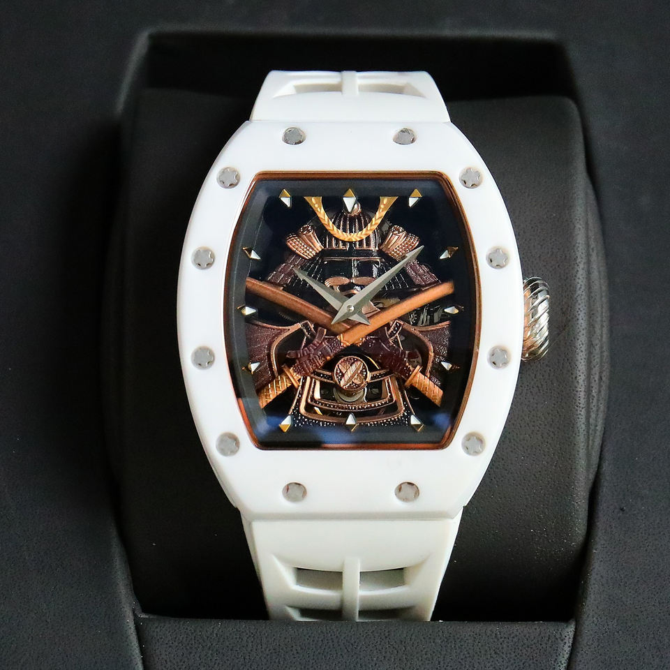นาฬิกาข้อมือทรงกระบอกเซรามิกสีขาวพรีเมียม ดีไซน์หน้าปัดแบบโครงกระดูกสไตล์ซามูไร ตกแต่งด้วยสกรู สำหรับผู้ชาย หรูหรา สปอร์ต