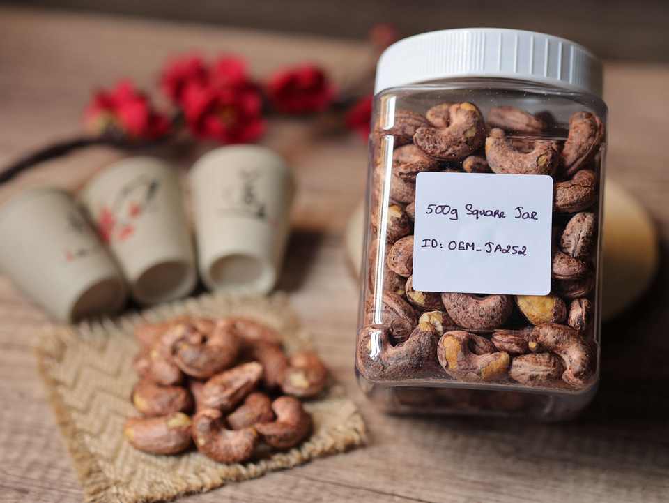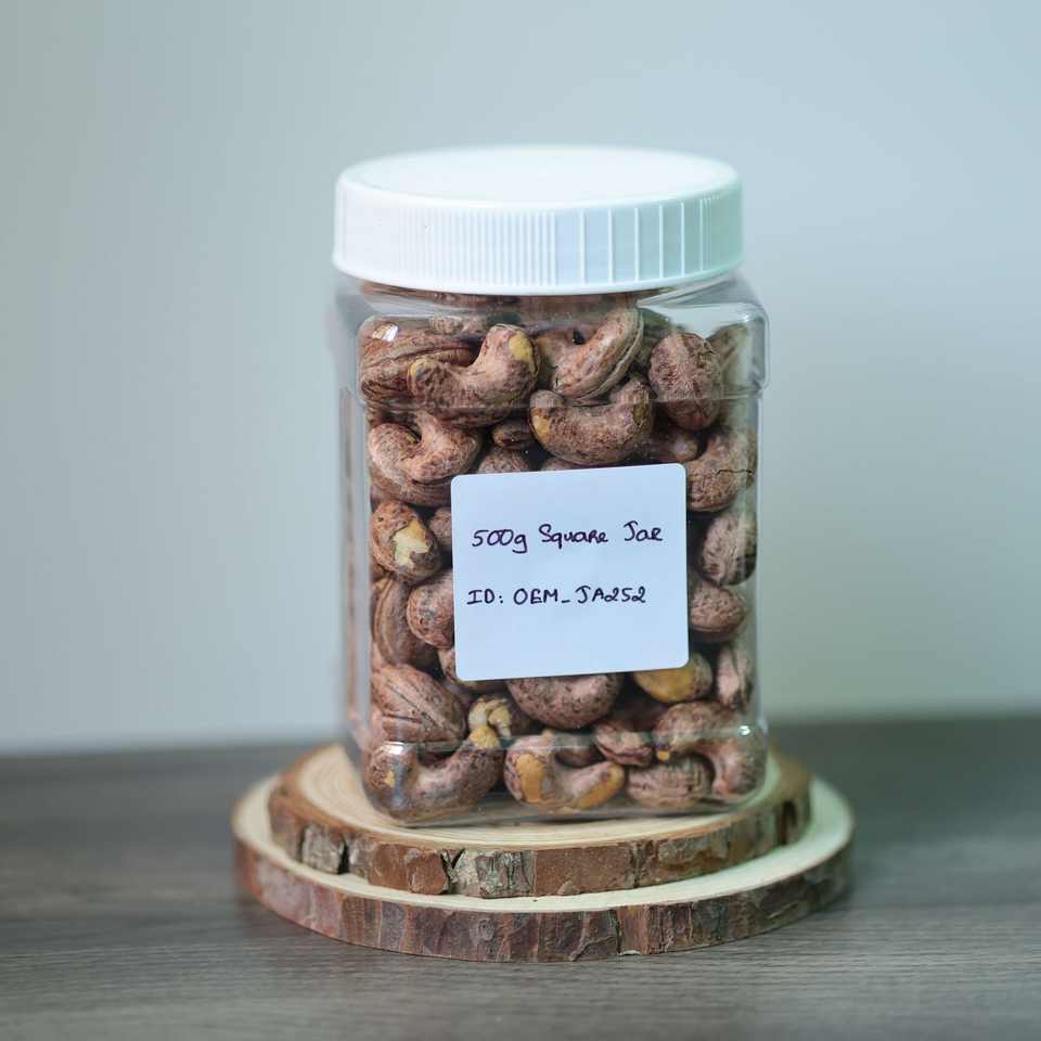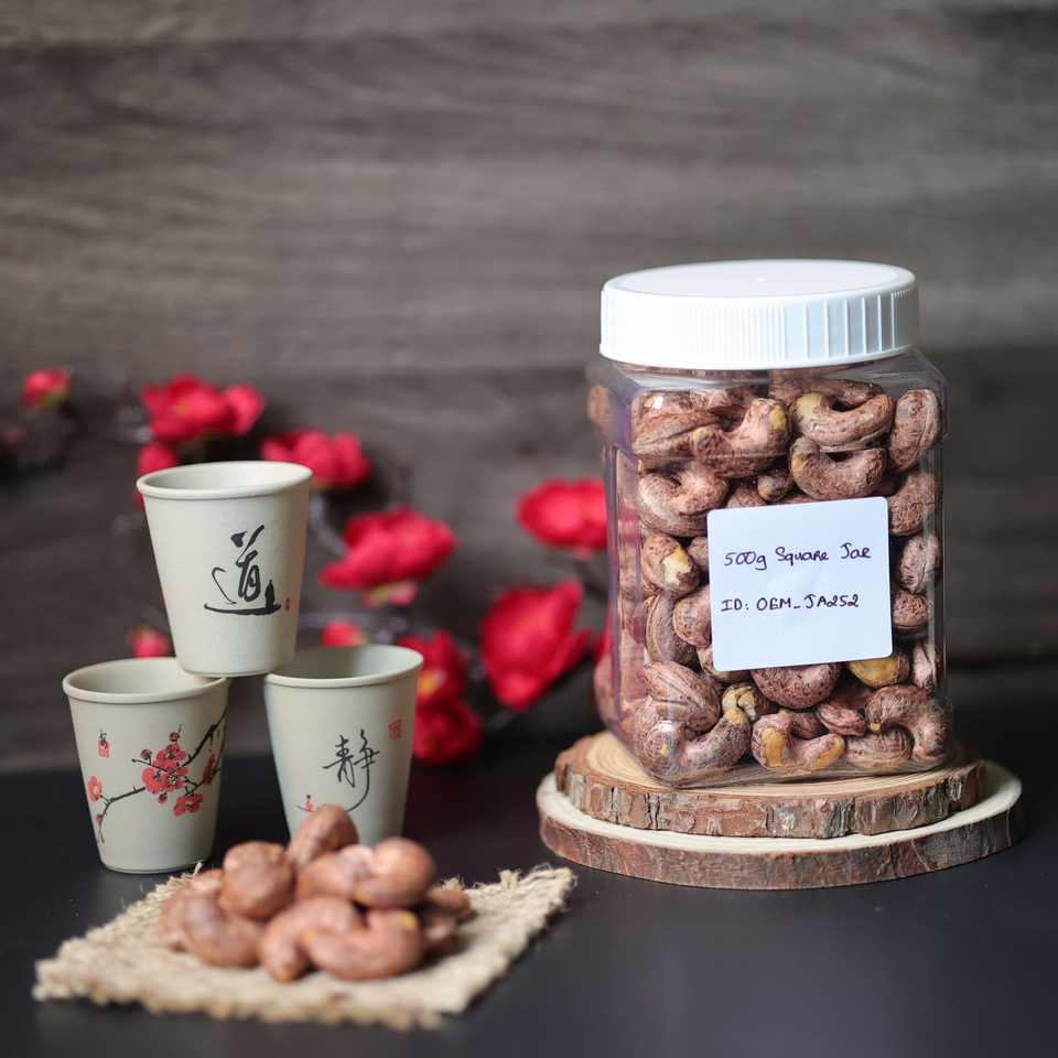 เม็ดมะม่วงหิมพานต์คั่วพรีเมียมในขวดสี่เหลี่ยม 500 กรัม ราคาสุดคุ้มจากโรงงานโดยตรง รับผลิตแบบ OEM