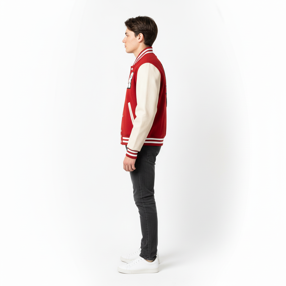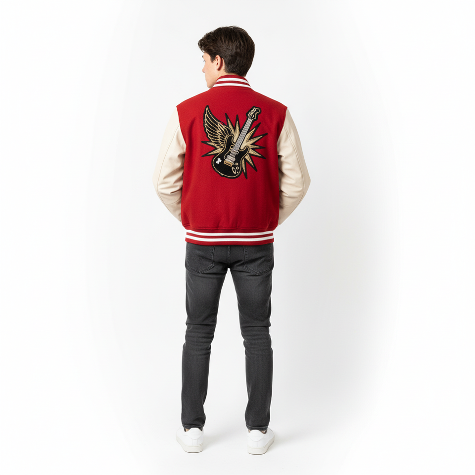 แจ็คเก็ตวาร์ซิตี้สีแดงร็อคสตาร์ระดับพรีเมียม - ผ้าขนสัตว์และหนังคุณภาพสูง สตรีทแวร์ MOQ ต่ำ