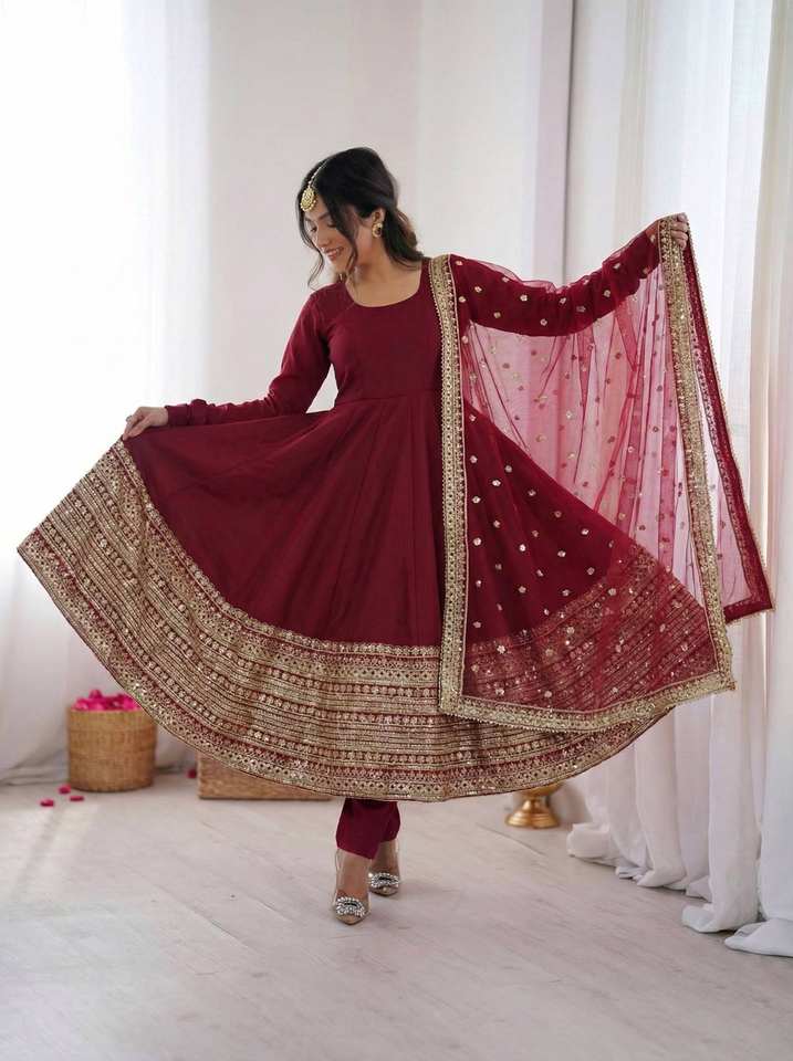 ชุดเดรส Anarkali ผ้าไหมโรมันพรีเมียม ทรงสามจุด ยาวเจ็ดสิบเมตร แขนยาวเต็มตัว พร้อมกระโปรงผ้าเครปธรรมชาติ พร้อมสวมใส่