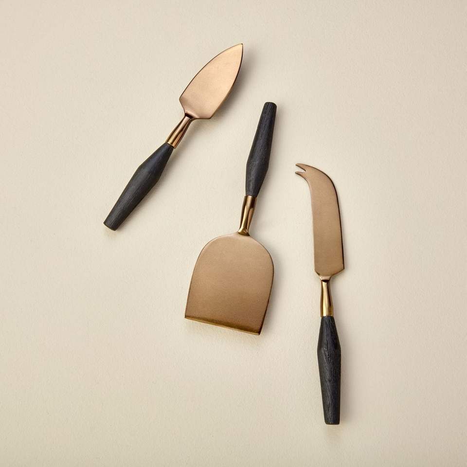 ชุดมีดชีสสแตนเลสเคลือบโรสโกลด์พรีเมียม ด้ามจับไม้สีเข้ม ออกแบบมาเพื่อการรับประทานอาหารสมัยใหม่และหรูหรา