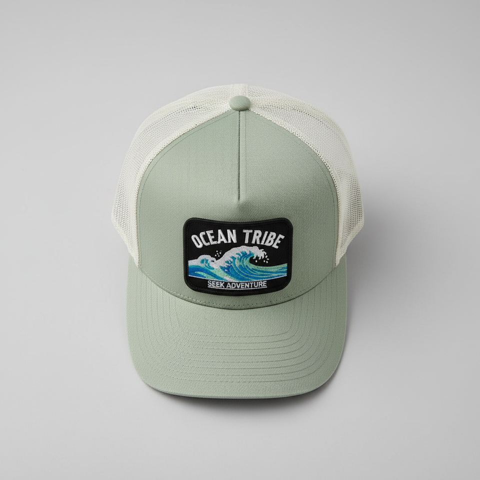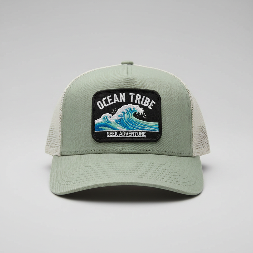 หมวกทรักเกอร์ลายชนเผ่าทะเลสีเขียวปราชญ์แบบพรีเมี่ยมหมวกเบสบอลกลางแจ้งปักลายคลื่นและแสวงหาการผจญภัย | ปรับตาข่ายด้านหลังได้