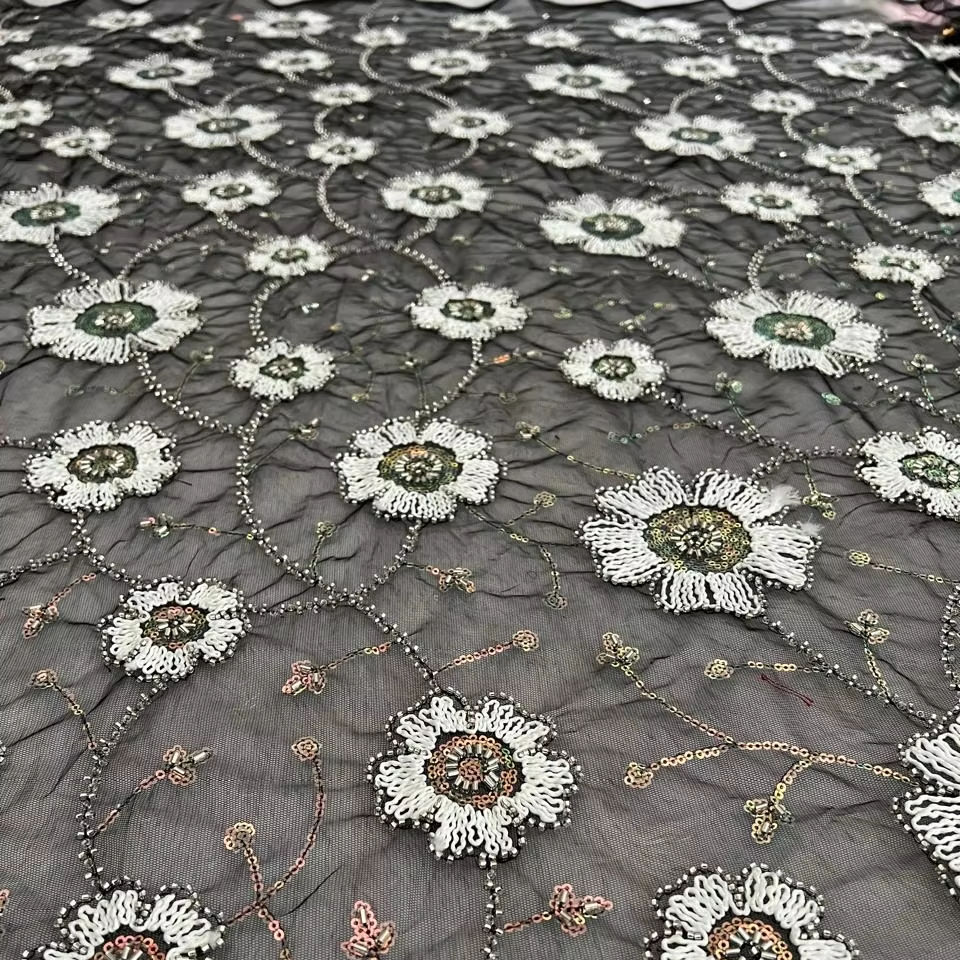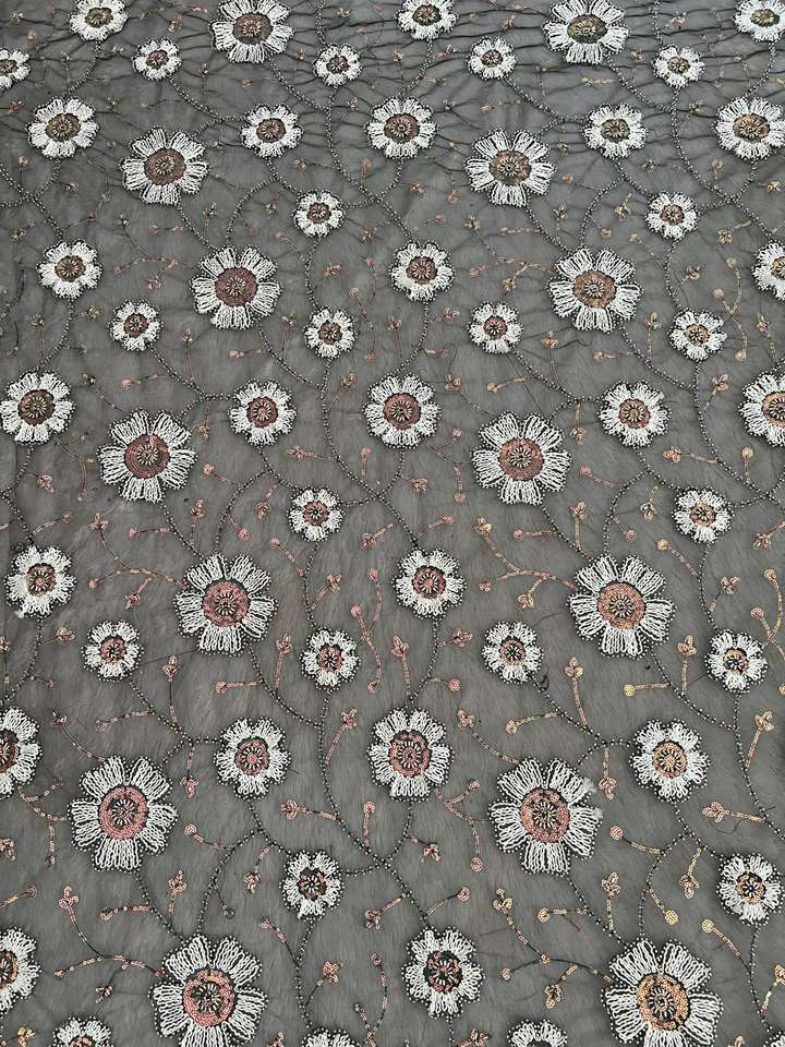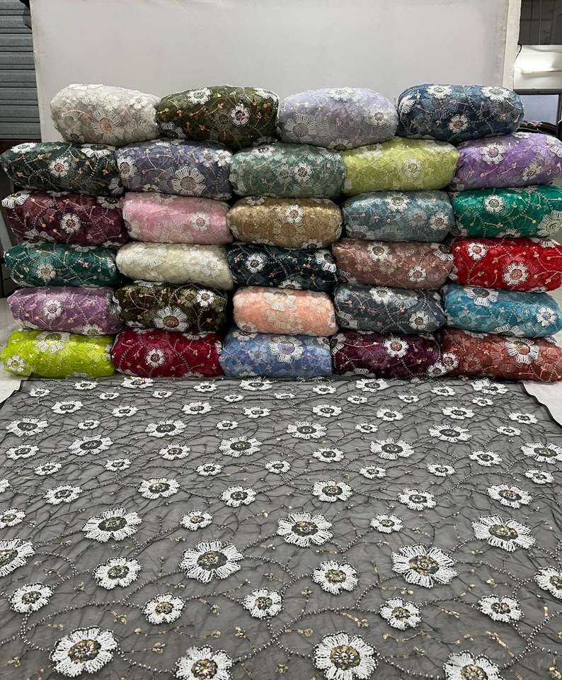 ผ้าตาข่ายปักเลื่อมแบบพรีเมี่ยมพร้อมลวดลายดอกไม้สำหรับชุดส่าหรีและเดรสมีหลายสี