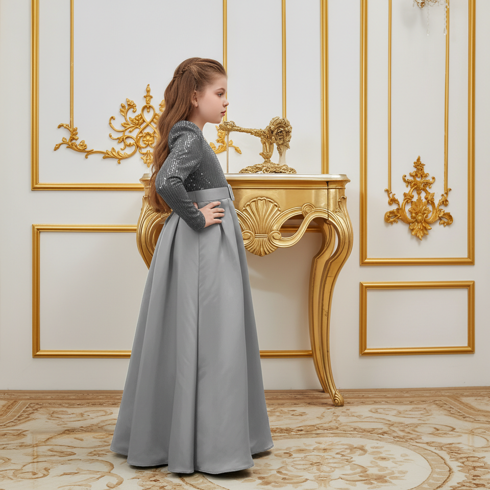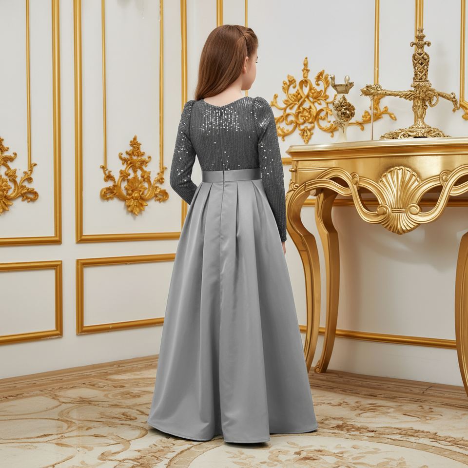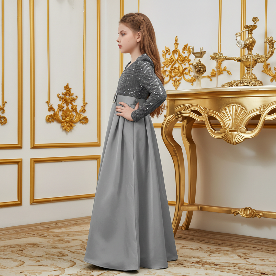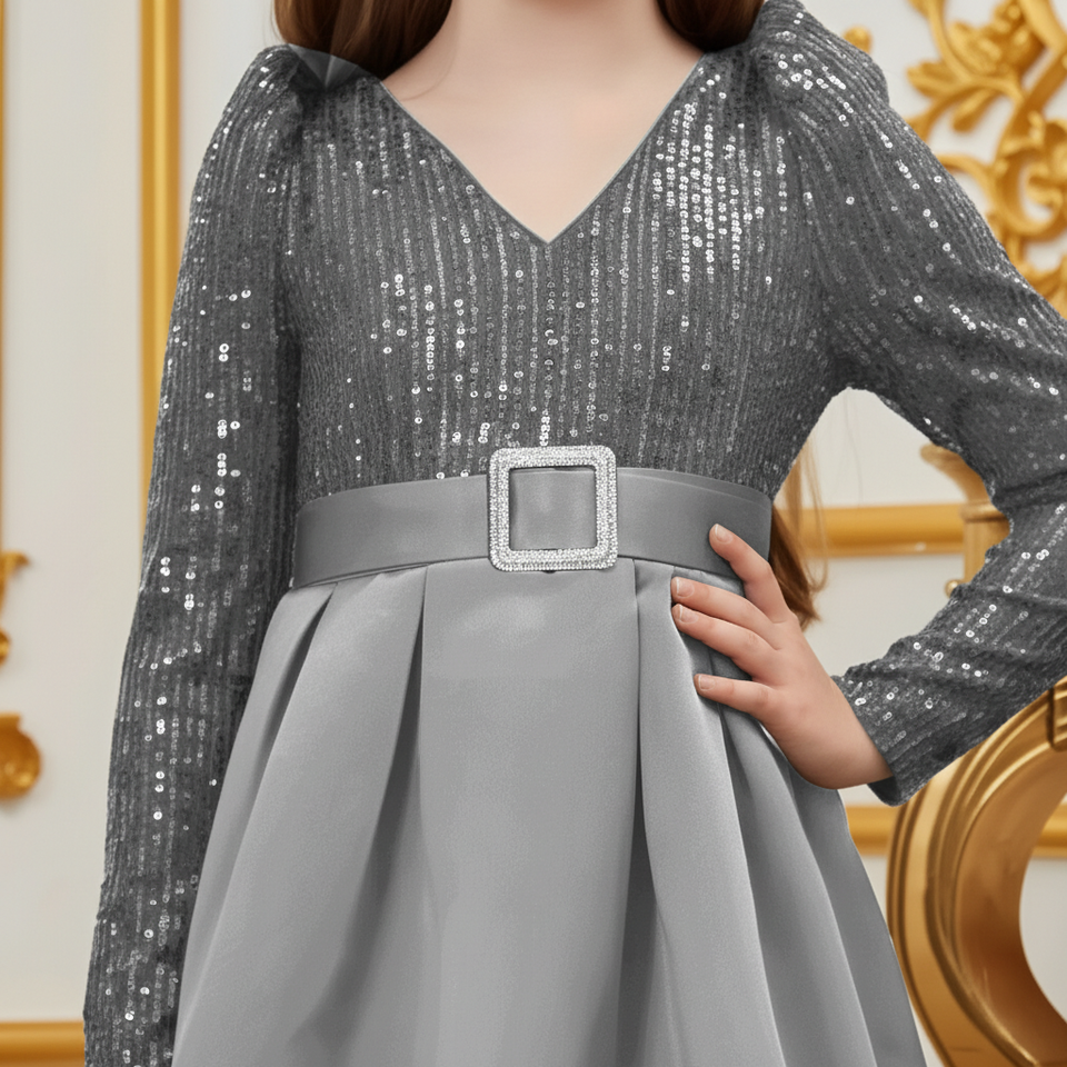 ชุดเดรสเด็กผู้หญิงสีเทา คอวี ประดับเลื่อมพรีเมียม ปักลายกำมะหยี่ ผ้าทูลล์หนา สำหรับงานเลี้ยงวันเกิดและงานแต่งงาน
