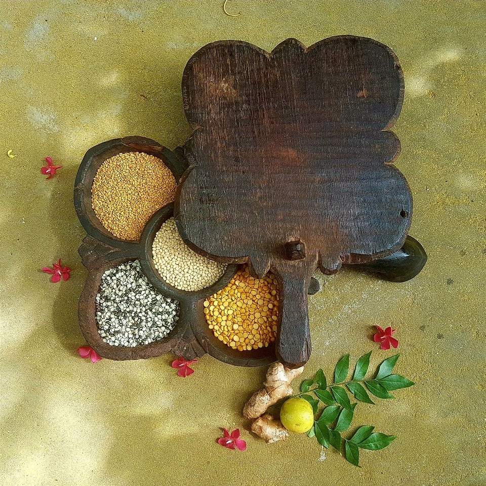 กล่องมาซาลาทำจากไม้สำหรับใช้ในห้องครัวพร้อมฝาศิลปะทำจากทองเหลือง