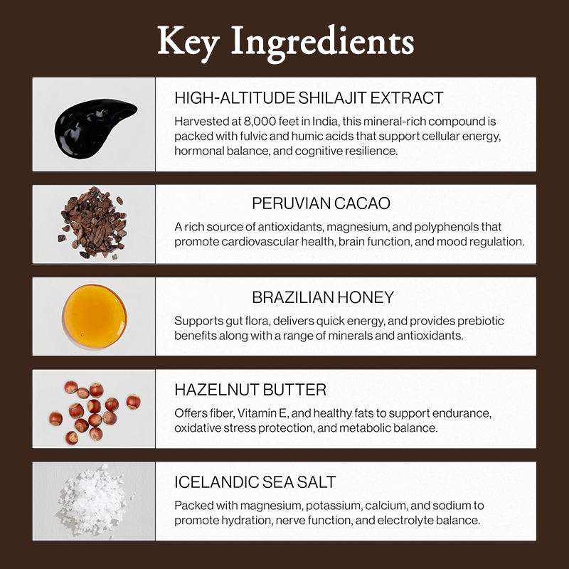 ส่วนผสมหลัก:สารสกัดชิลาจิตจากที่สูง, โกโก้เปรูออร์แกนิก, เนยเฮเซลนัท, เกลือทะเลไอซ์แลนด์, น้ำผึ้งบราซิล