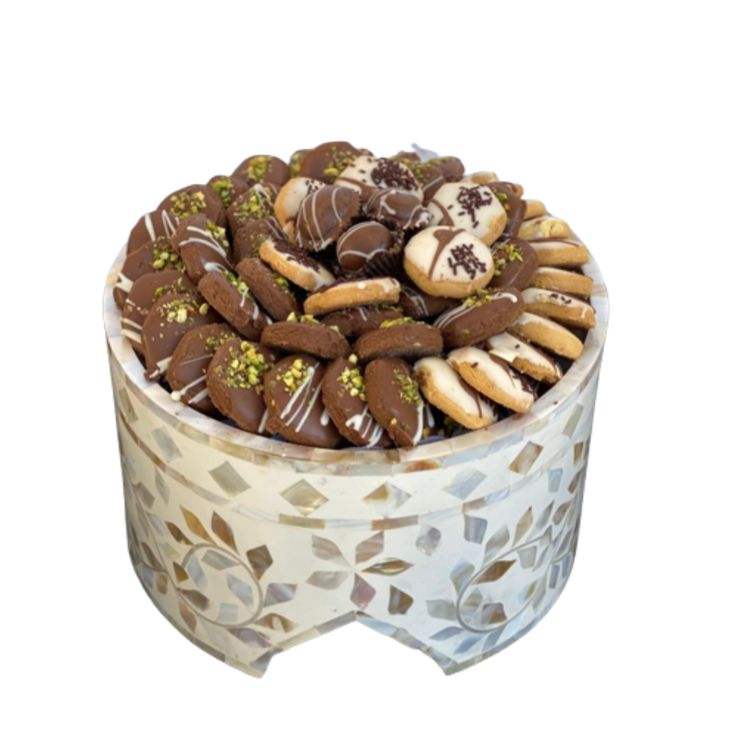 ชามเสิร์ฟช็อกโกแลตสีเงินพรีเมียม พร้อมริบบิ้นตกแต่งและช็อกโกแลตหรูหราหลากหลายชนิด สำหรับงานแต่งงานสุดหรู