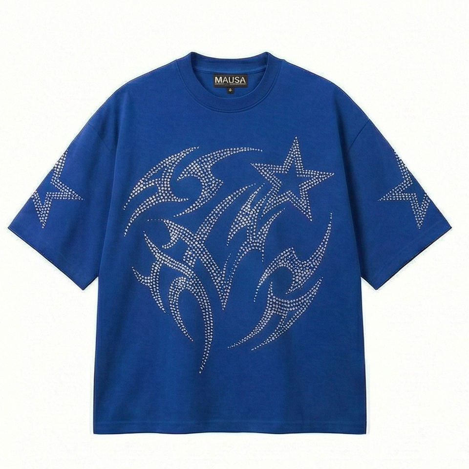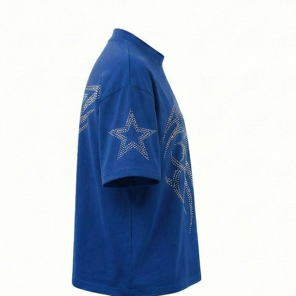 เสื้อยืดผู้ชายประดับเพชรเม็ดใหญ่สีเงินพรีเมียม สไตล์สตรีทแวร์หรูหรา ทรงโอเวอร์ไซส์