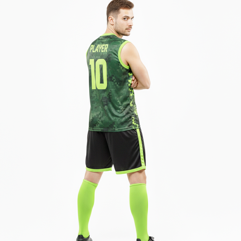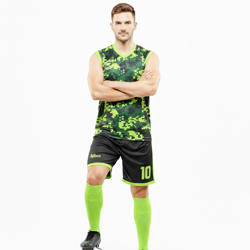 ชุดฝึกซ้อมฟุตบอลแบบไม่มีแขนพรีเมียม แห้งเร็ว ชุดฟุตบอลสีเขียวแบบกำหนดเอง เสื้อแขนกุดโพลีเอสเตอร์ 100% พร้อมกางเกงขาสั้น