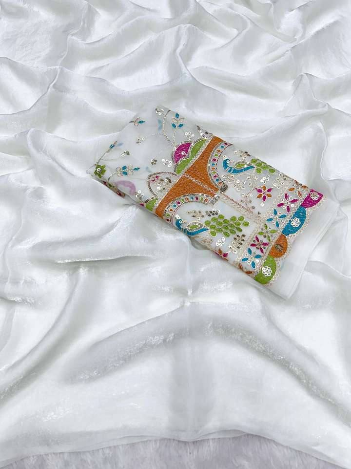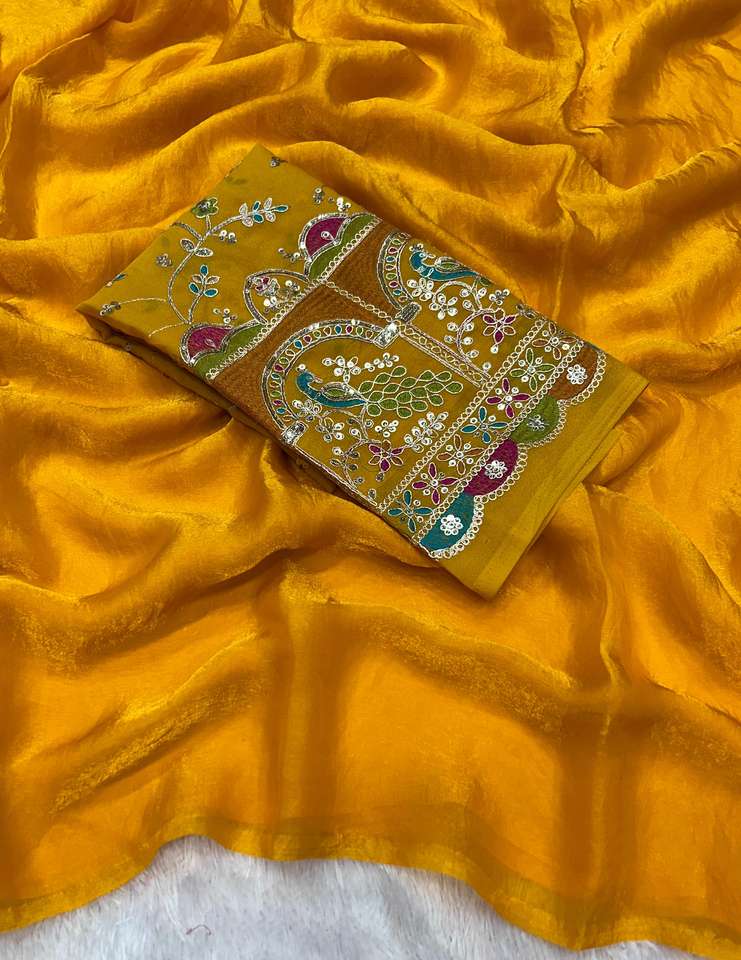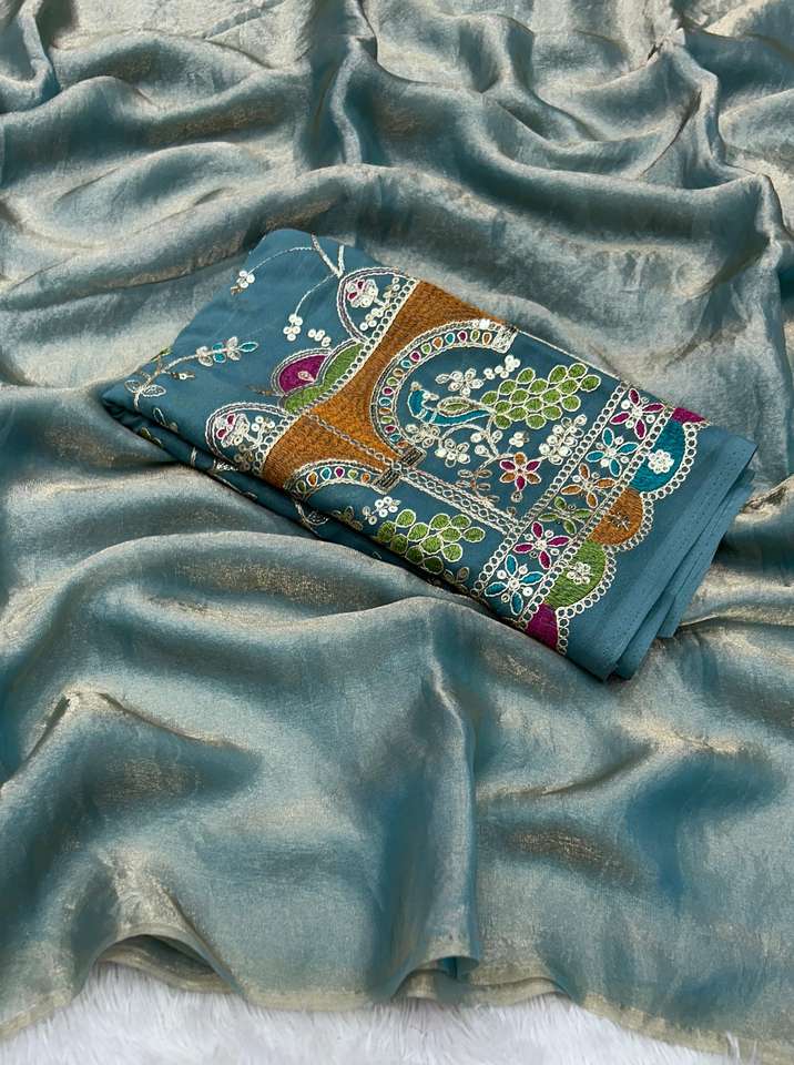 Premium Soft Fendy Satin Silk Saree with Ornate Zari Embroidery Cutwork Border and Designer Blouse