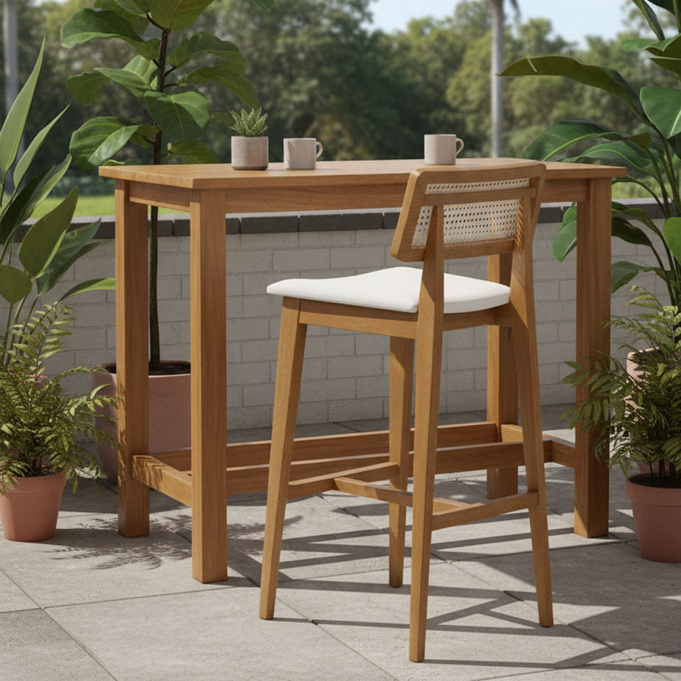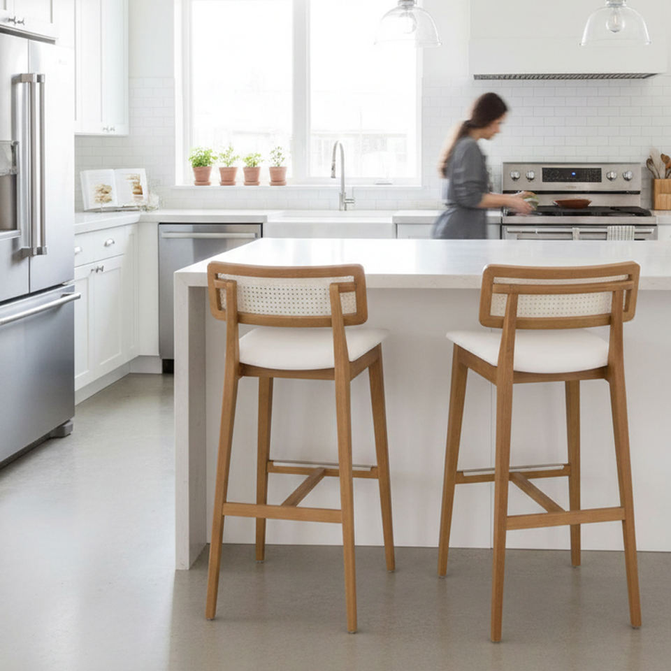 เก้าอี้บาร์ไม้สักแท้คุณภาพพรีเมียม พนักพิงหวายหุ้มเบาะ เหมาะสำหรับบ้านสไตล์ฟาร์มเฮาส์ บาร์ในบ้าน เคาน์เตอร์ครัว ห้องรับประทานอาหาร ร้านค้า คาเฟ่สมัยใหม่
