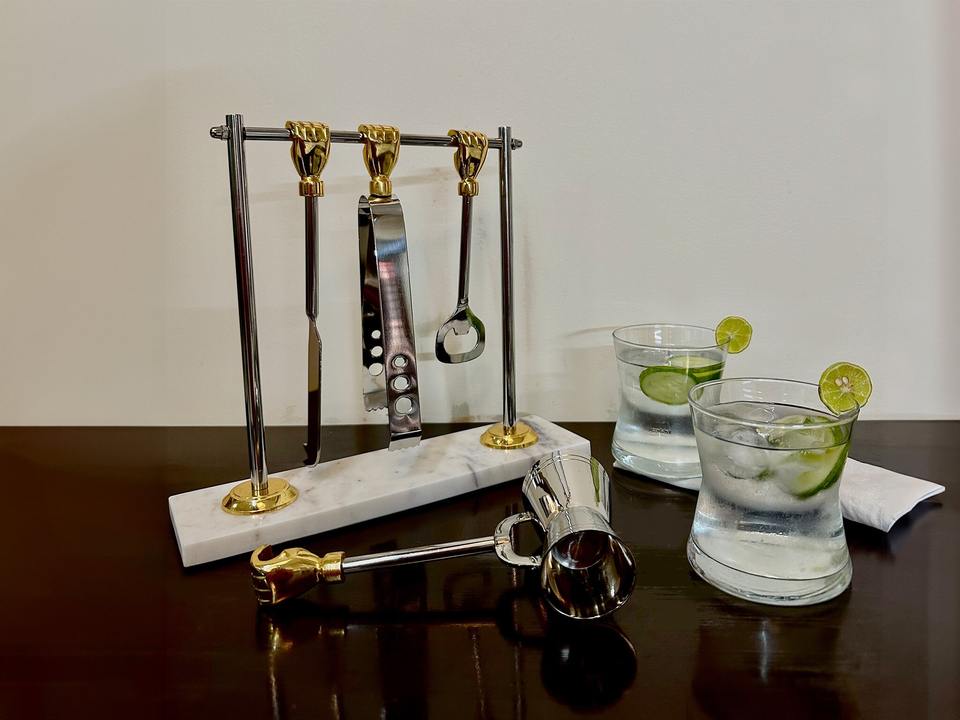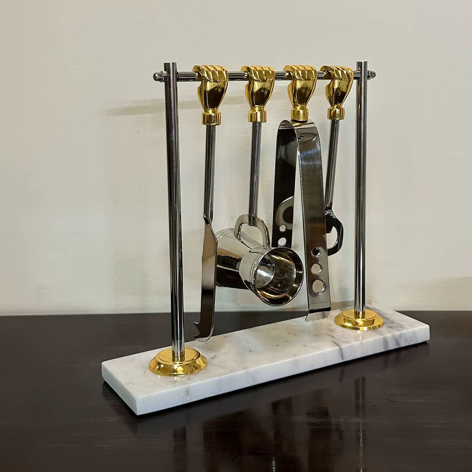 ชุดเครื่องมือบาร์สเตนเลสสตีลพรีเมียมพร้อมด้ามจับสีทองและฐานหินอ่อน สำหรับเคาน์เตอร์บาร์ที่บ้านและการจัดงานปาร์ตี้ จากอินเดีย