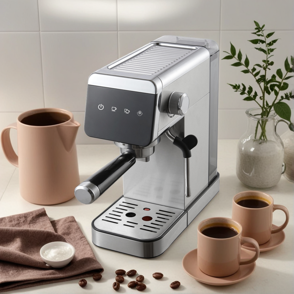 เครื่องชงกาแฟเอสเปรสโซ่กึ่งอัตโนมัติทำจากสแตนเลสเกรดพรีเมี่ยมควบคุมดิจิตอลด้วยแรงดัน20บาร์ฟังก์ชั่นตั้งโปรแกรมได้สำหรับบ้าน