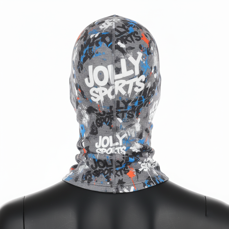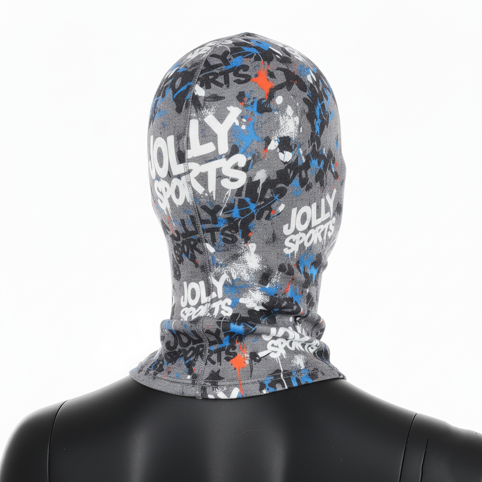 หน้ากากไหมพรมโพลีเอสเตอร์สแปนเด็กซ์แบบเต็มหน้าพิมพ์ลายสีเทาหลากสีออกแบบโลโก้ได้ตามต้องการ