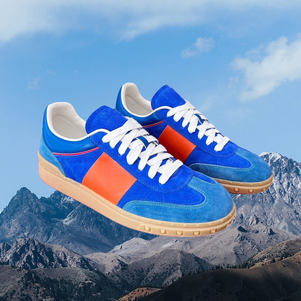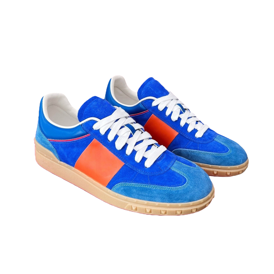 รองเท้าผ้าใบแบบสวมลำลองทรงเตี้ย สไตล์เรโทร สีน้ำเงิน-ส้ม วัสดุหนังกลับพรีเมียม พร้อมเชือกผูก กันลื่น ลายทางตัดสี สำหรับผู้ชายและผู้หญิง วัสดุตาข่าย