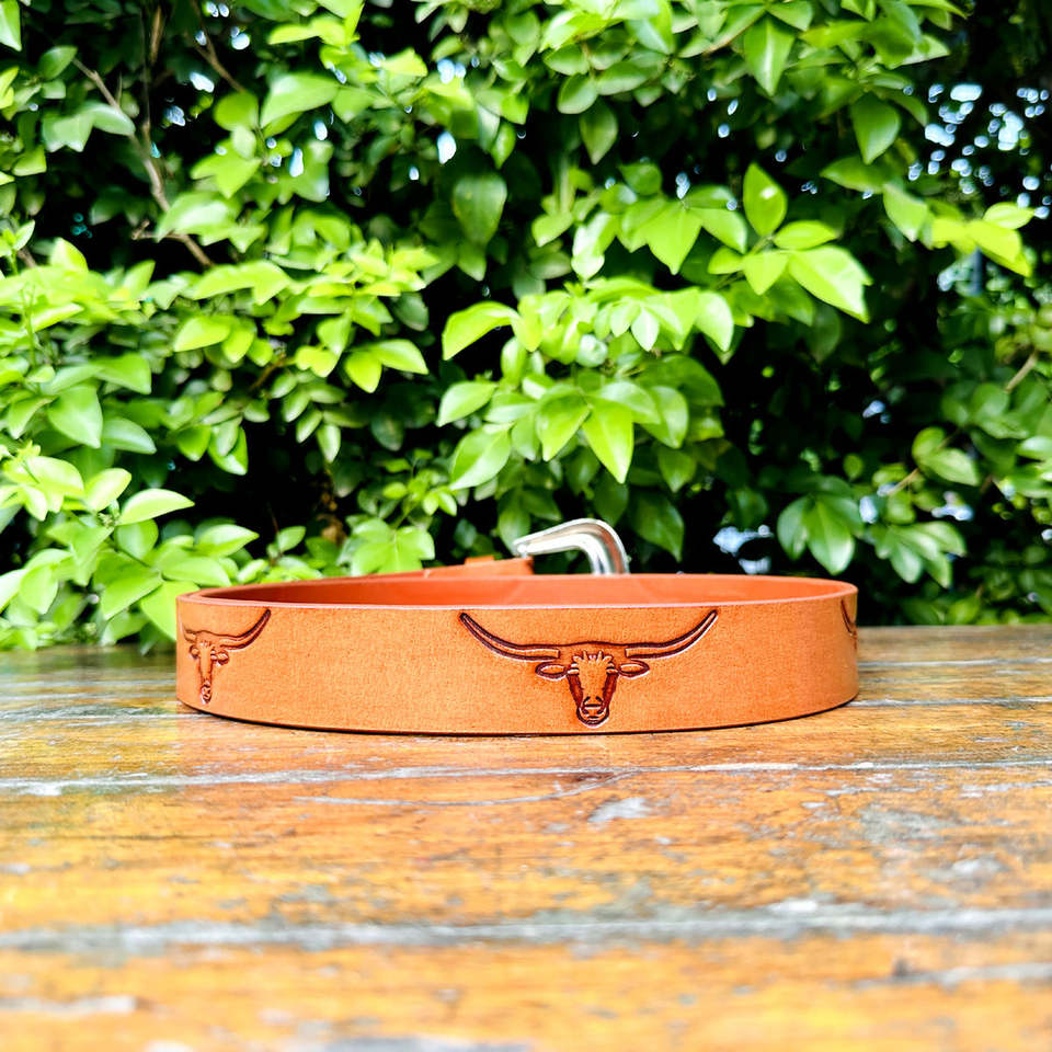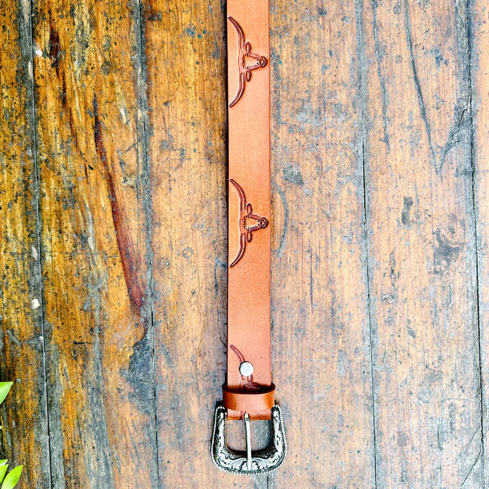 Premium Tan Genuine Leather Belt Hand Finished Bull Horn Embossed Gaucho Western Style Heavy Buckle Rock R M INTERNATION