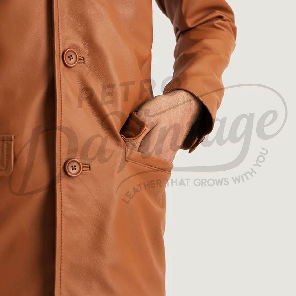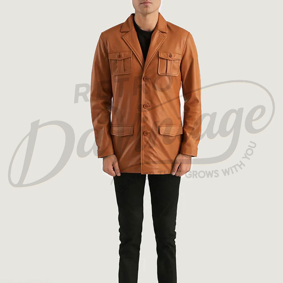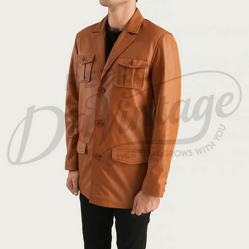 เสื้อแจ็คเก็ตหนังแกะแท้สไตล์ซาฟารีสีแทนพรีเมียมสำหรับผู้ชาย สไตล์วินเทจ มีกระเป๋าสี่ช่อง ติดกระดุมแบบลำลอง