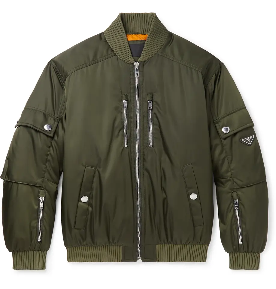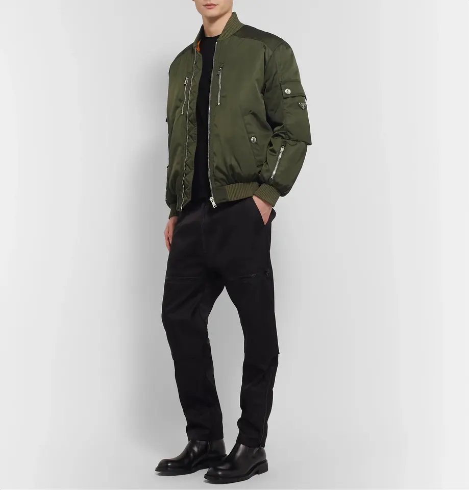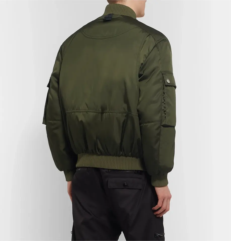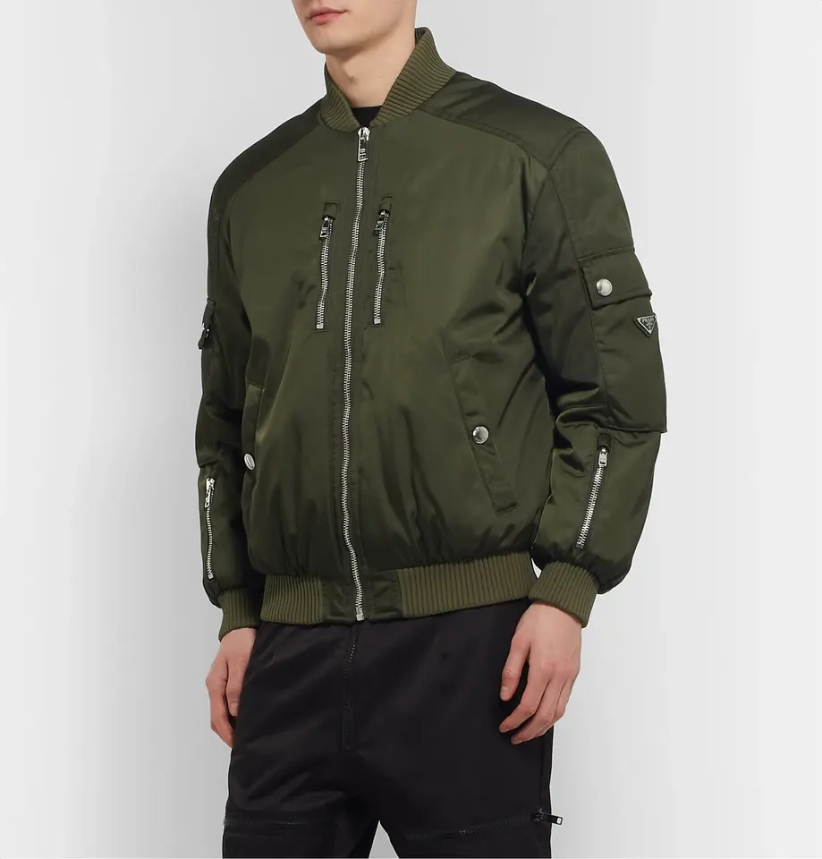 แจ็คเก็ตบอมเบอร์ไนล่อนมีซิปอเนกประสงค์สำหรับผู้ชายเสื้อโค้ทใส่เที่ยวสีเขียวมะกอกมีกระเป๋าขนาดใหญ่ออกแบบโลโก้ได้ตามต้องการ