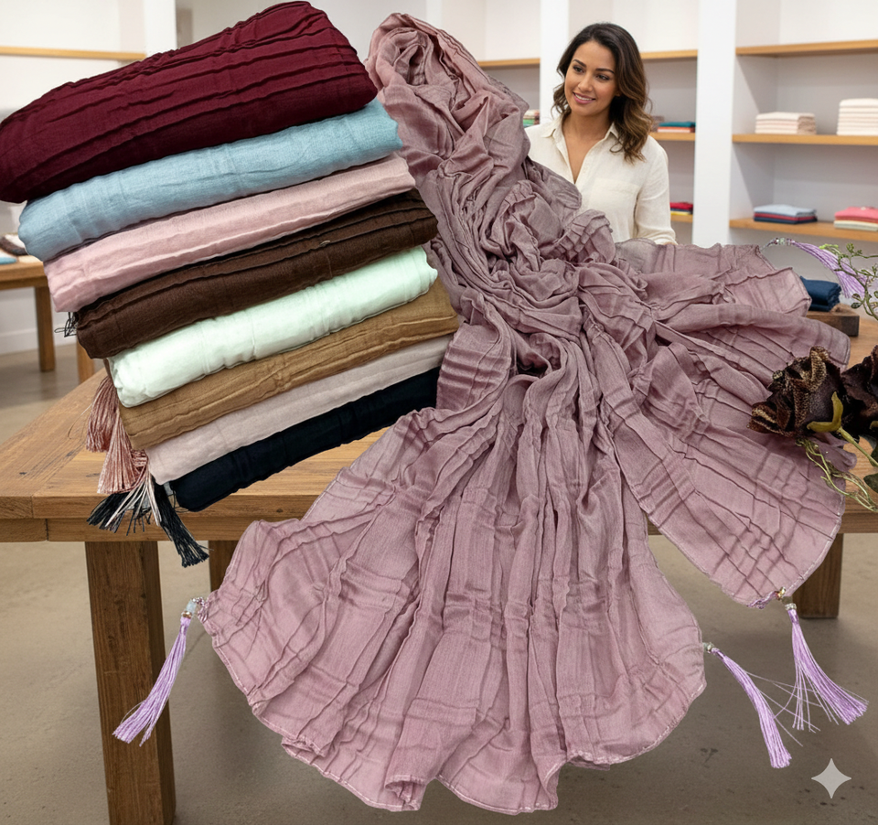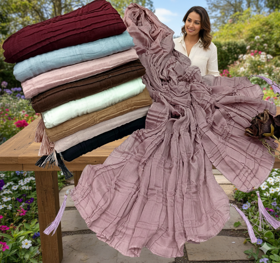 ผ้าคลุมศีรษะชีฟองลายดอกไม้เนื้อผ้าฝ้ายย่นแบบพรีเมียมสำหรับผู้หญิง ระบายอากาศได้ดี น้ำหนักเบา พับจีบ ผ้าคลุมยาว ดีไซน์หรูหรา ขอบผ้าประดับพู่