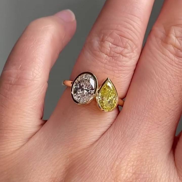 แหวนหมั้นเพชรทรงลูกแพร์สีเหลืองขนาด 2.00 กะรัต รุ่นพรีเมียม Toi Et Moi เพชรเลี้ยงในห้องปฏิบัติการ ความสะอาดระดับ VVS2 ตัวเรือนแพลตตินั่มแบบฝังขอบ พร้อมวงแหวนแบบเปิด