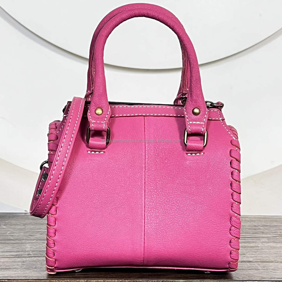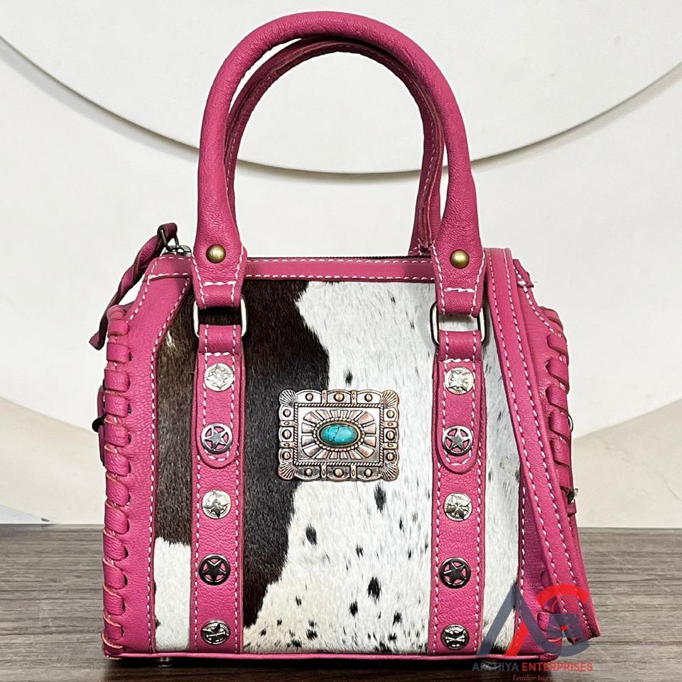 กระเป๋าเดินทางดีไซน์เนอร์หนังวัวแท้ขนาดเล็กกะทัดรัด ประดับหมุดหนังสีชมพูและคอนโชสีฟ้าคราม พร้อมดีเทลตกแต่งอย่างประณีต