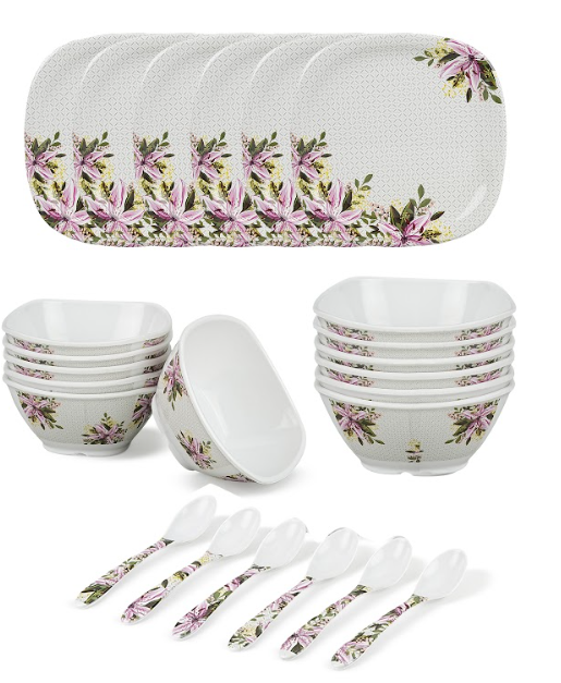 ชุดรับประทานอาหารเมลามีน24ชิ้นแบบพรีเมี่ยมเคลือบ3ชั้นทนทานต่อการแตกหักจานผักและช้อนชาสำหรับใช้ในบ้าน