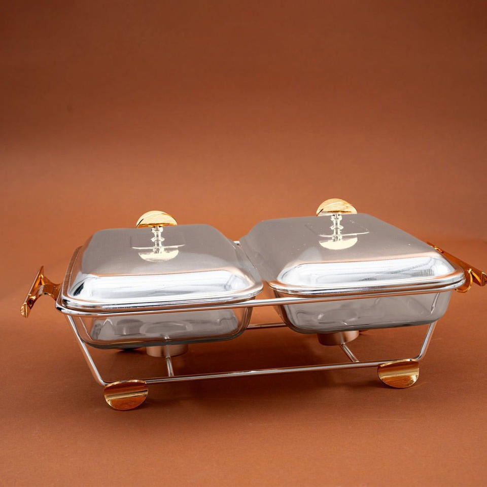 ชุดอุ่นอาหารแบบสองช่องพร้อมฝาแก้วคุณภาพพรีเมียม โครงสแตนเลสพร้อมหูจับสีทอง รูปทรงสี่เหลี่ยมผืนผ้า 2 ช่อง สำหรับร้านอาหารและบุฟเฟ่ต์