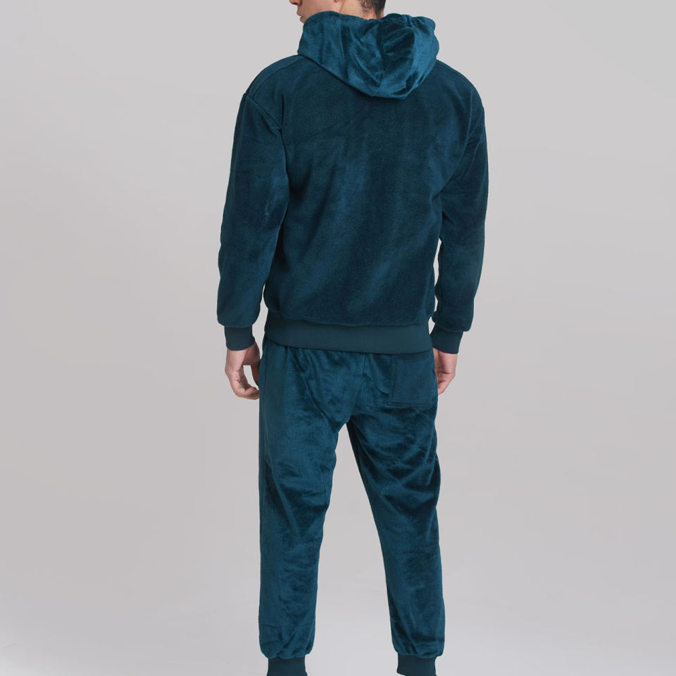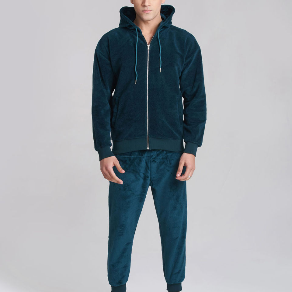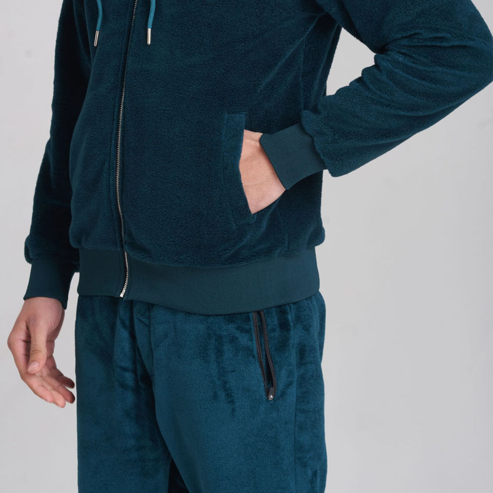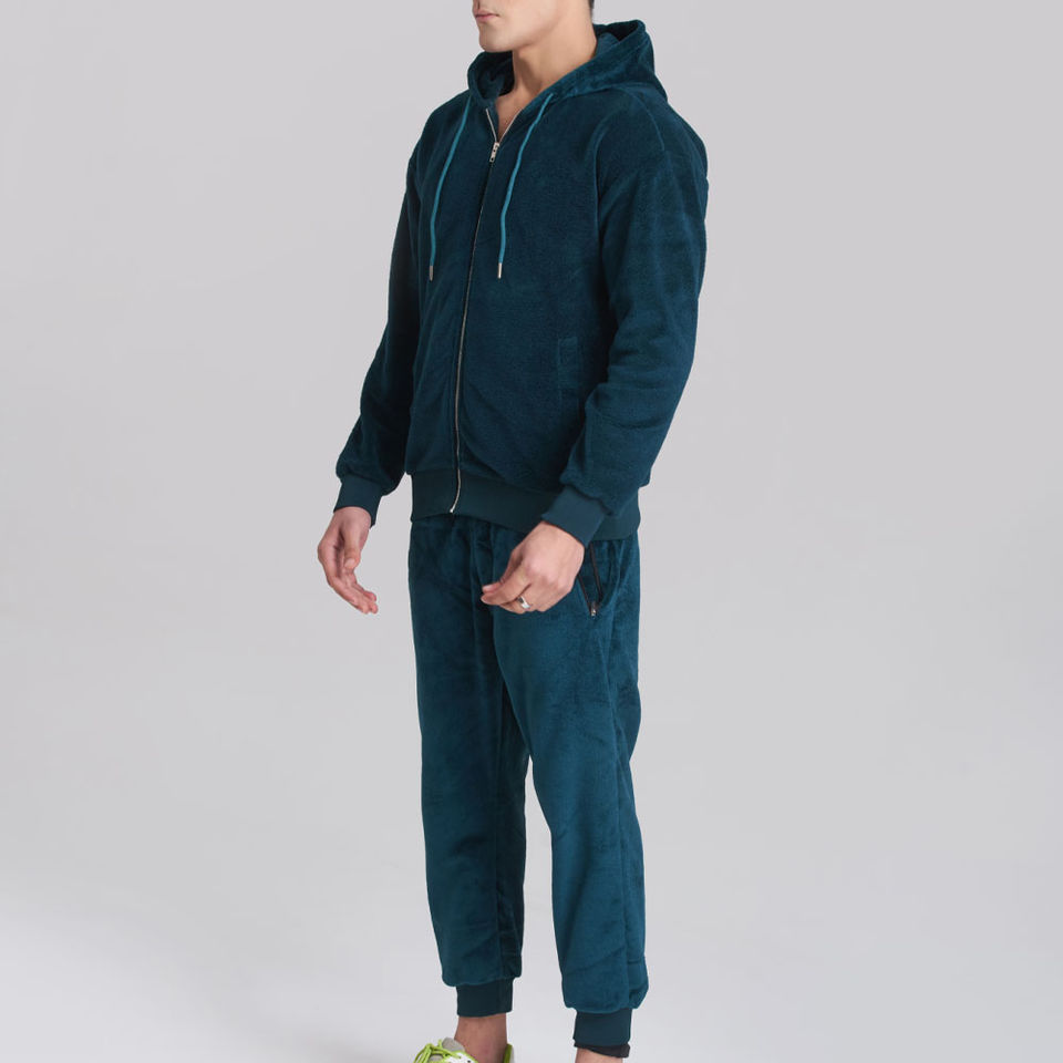 ชุดวอร์มกำมะหยี่พรีเมียมสีน้ำเงินกรมท่าสำหรับผู้ชาย เสื้อแจ็คเก็ตมีฮู้ดแบบซิปเต็มตัวและกางเกงจ็อกเกอร์ ชุดลำลองสำหรับเล่นกีฬา