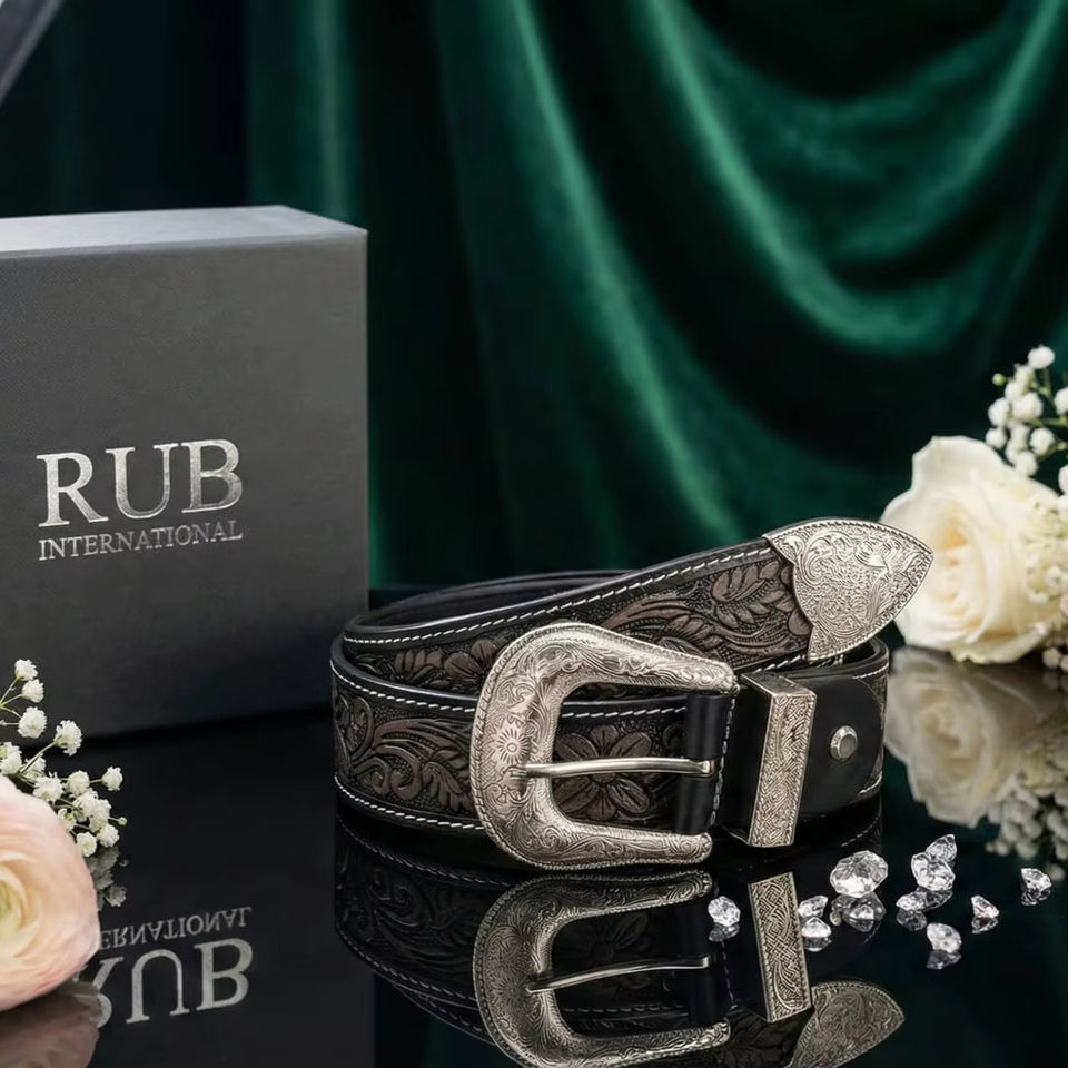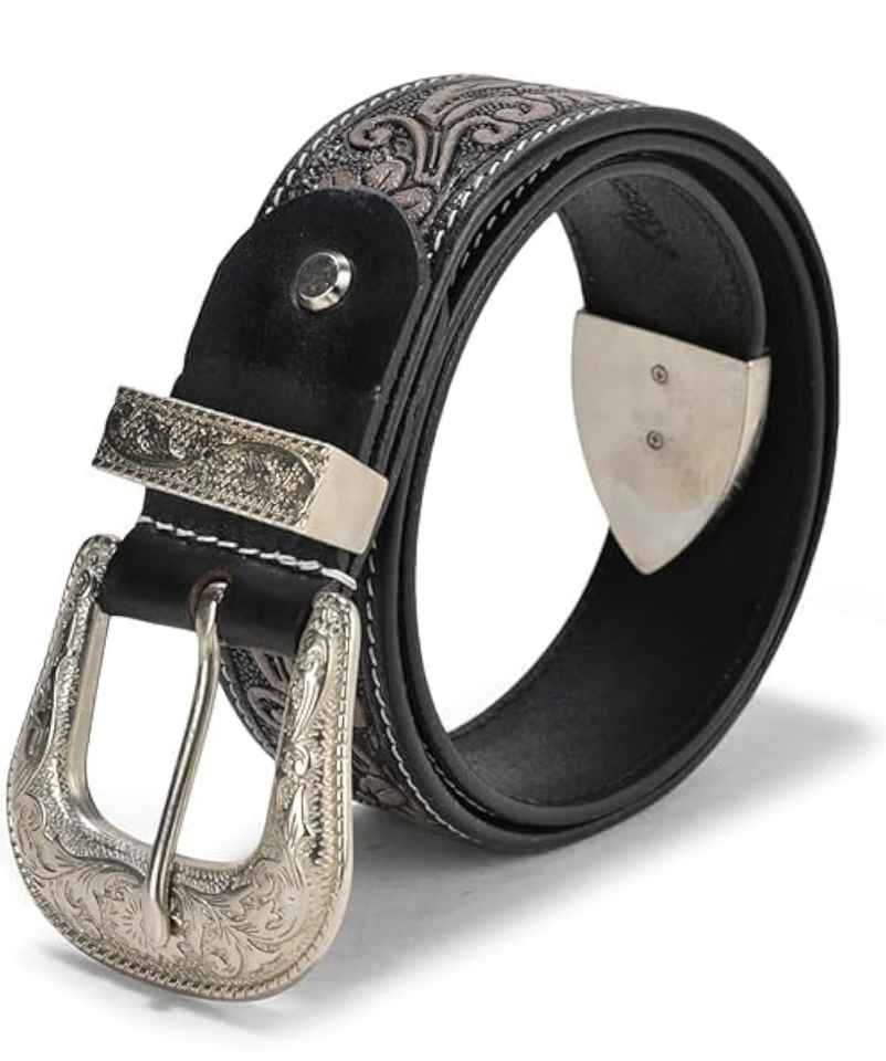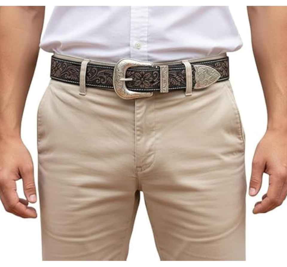 เข็มขัดหนัง PU สไตล์คาวบอยตะวันตกสำหรับผู้ชาย ลายดอกไม้สลัก พร้อมหัวเข็มขัดเงินแบบสลัก ปรับแต่งสีได้ ทนทาน สไตล์วินเทจ