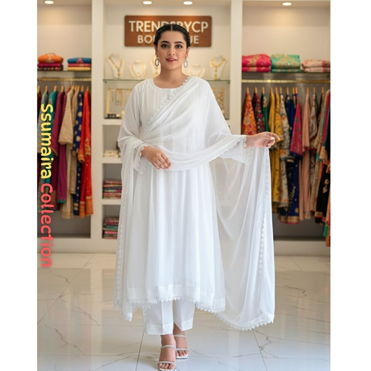 ชุดอานาร์กาลีสีขาวพรีเมียม คอลเลคชั่นอายชา บี ซูไมรา ชุด 3 ชิ้น ผ้าชีฟองเย็บสำเร็จ สำหรับงานพิธีการ งานเลี้ยง ตกแต่งด้วยลูกไม้ จัดส่งรวดเร็ว