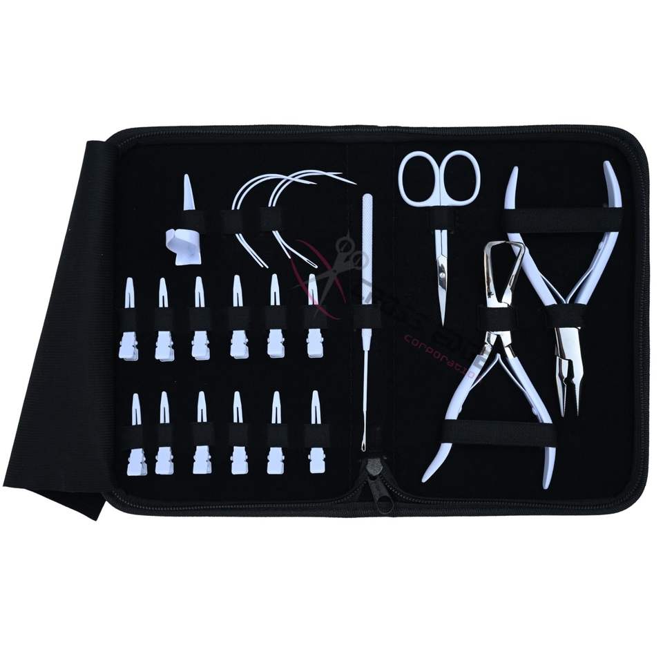 ชุดอุปกรณ์ต่อผมสีขาวพรีเมียม พร้อมคีมหนีบไมโครลิงค์ คีมถอด คีมโค้ง เข็มโค้ง กรรไกร และอุปกรณ์ตะขอ