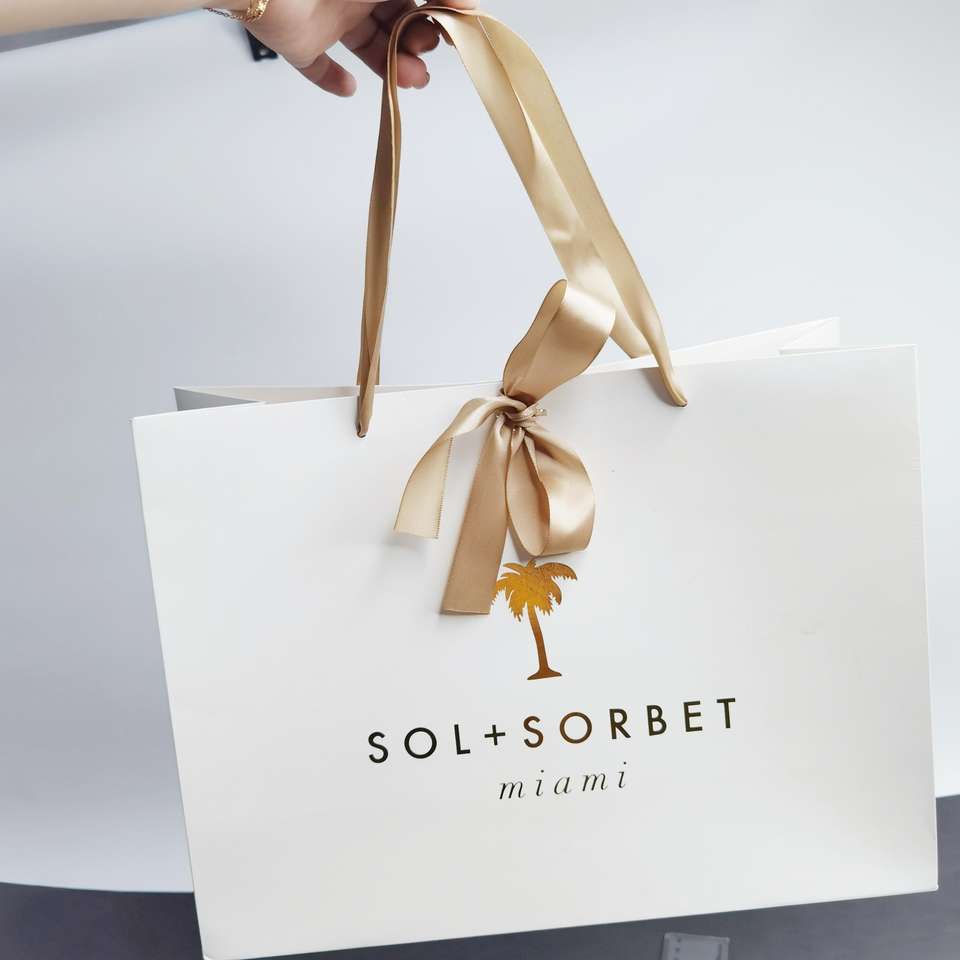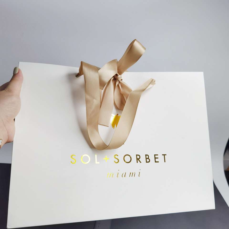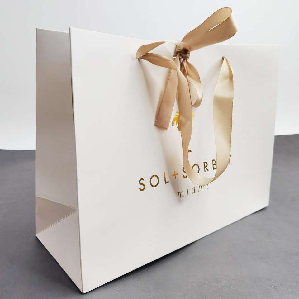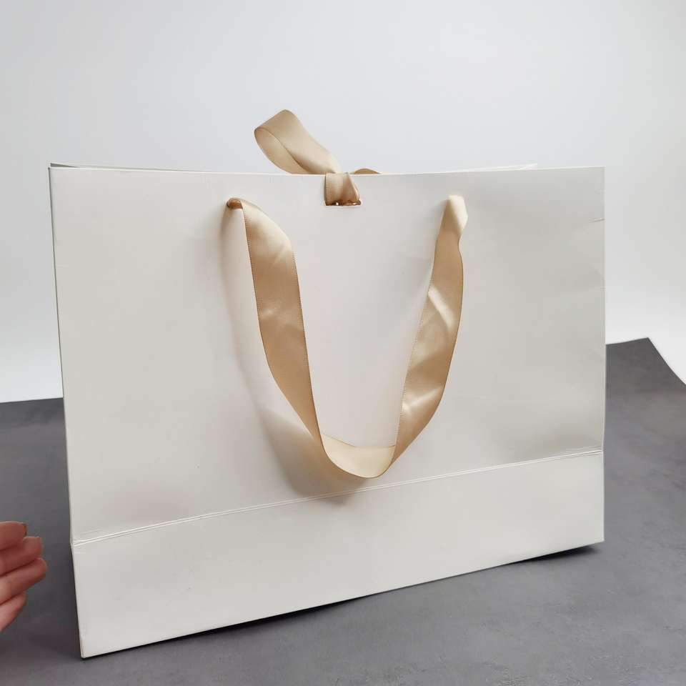 ถุงของขวัญกระดาษขาวพรีเมียม พร้อมปั๊มฟอยล์ทองและโบว์ริบบิ้นผ้าซาติน - บรรจุภัณฑ์หรูหราสำหรับร้านบูติก