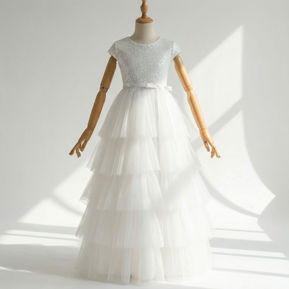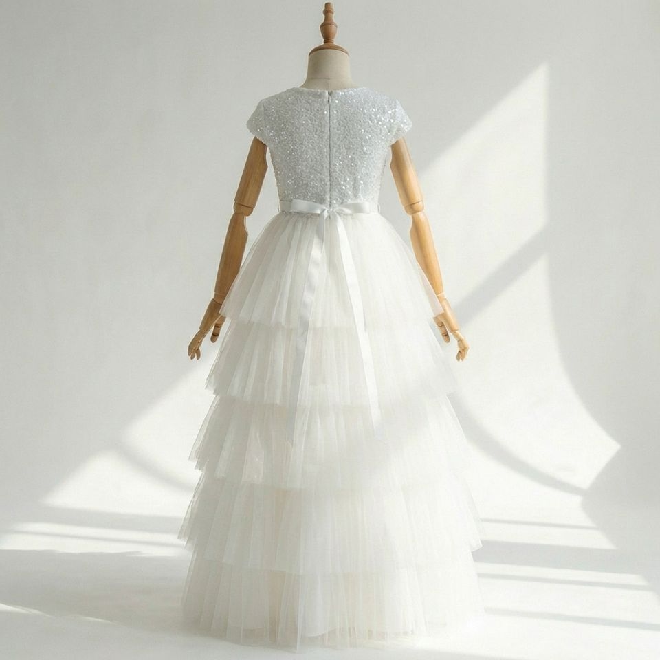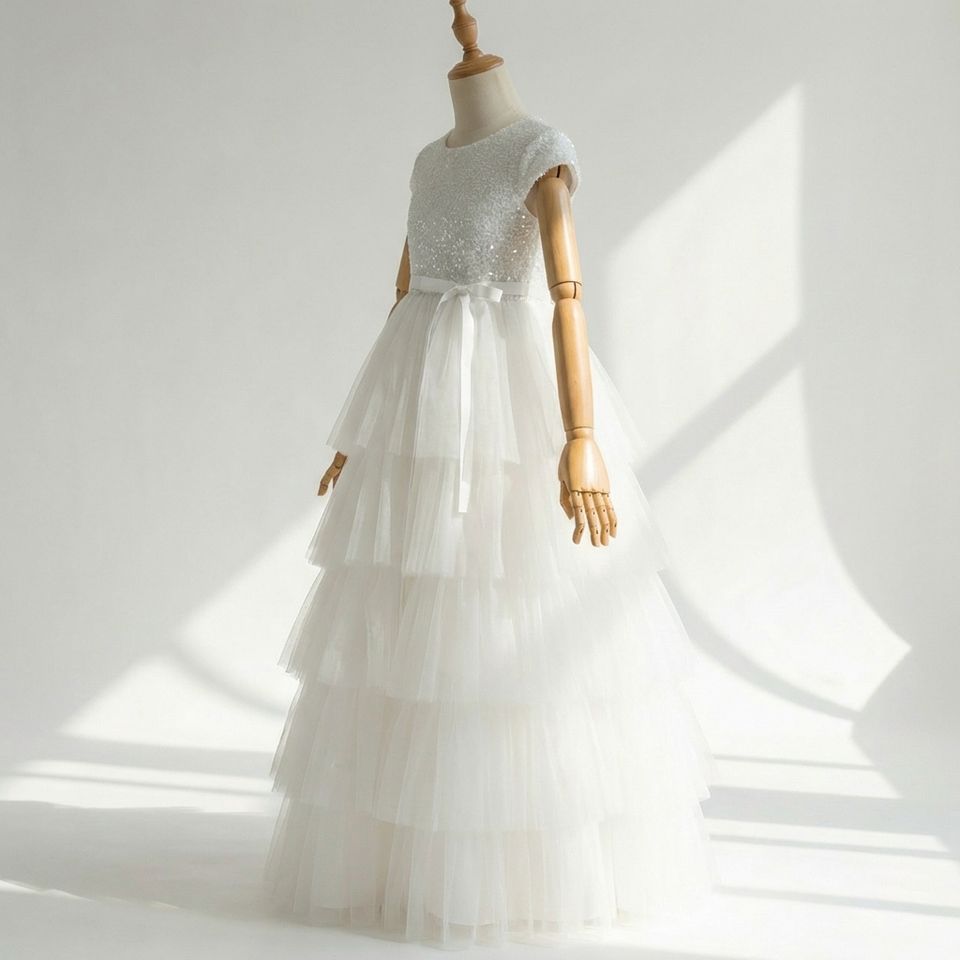 ชุดเดรสเด็กผู้หญิงผ้าทูลล์ปักเลื่อมสีขาวพรีเมียม แต่งเลเยอร์ สำหรับงานพิธีทางศาสนาคริสต์ สไตล์บูติก เหมาะสำหรับเทศกาลอีสเตอร์