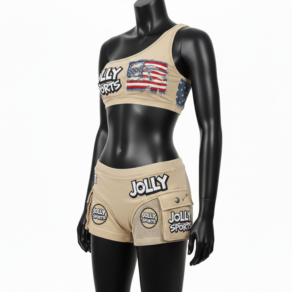 ชุดบิกินี่พรีเมียมสำหรับผู้หญิง ผ้าโพลีเอสเตอร์ผสมสแปนเด็กซ์ ยืดหยุ่นได้ 220 GSM สีเบจทราย แต่งกระเป๋าตาข่าย พร้อมโลโก้ปัก