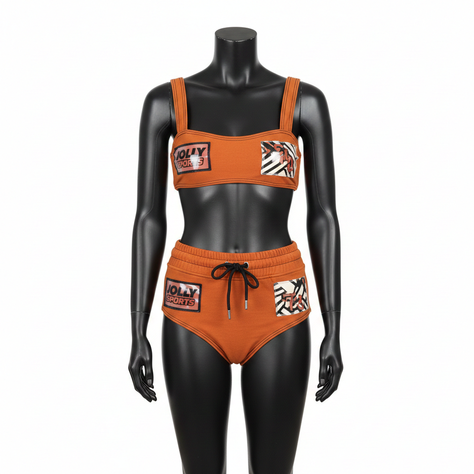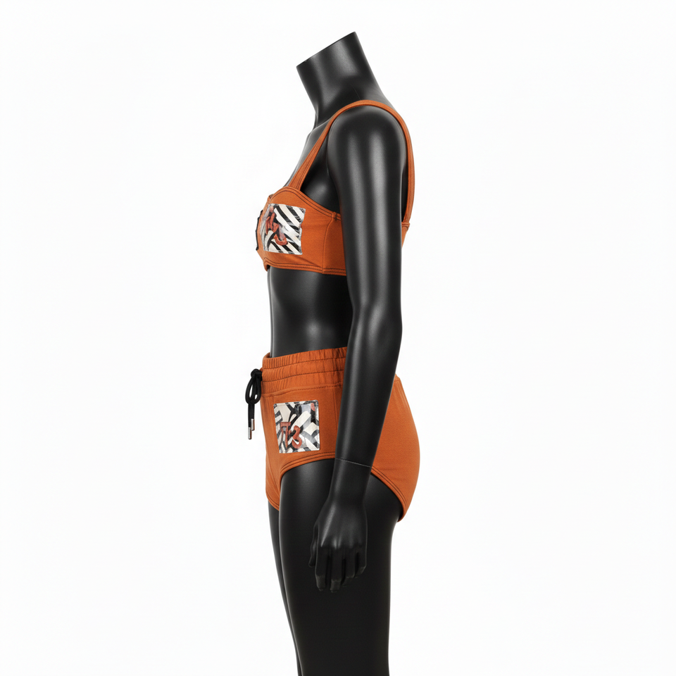 ชุดบิกินี่พรีเมียมสำหรับผู้หญิง ผ้าโพลีเอสเตอร์ผสมสแปนเด็กซ์ยืดได้ 220 GSM สีส้มไหม้ ดีไซน์แผงตัดต่อ พร้อมป้ายโลโก้ทอแบบกำหนดเอง ชุดบิกินี่ผู้หญิง