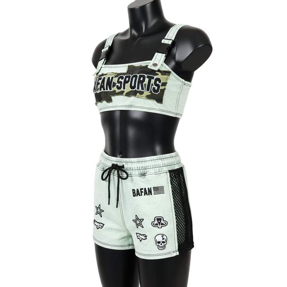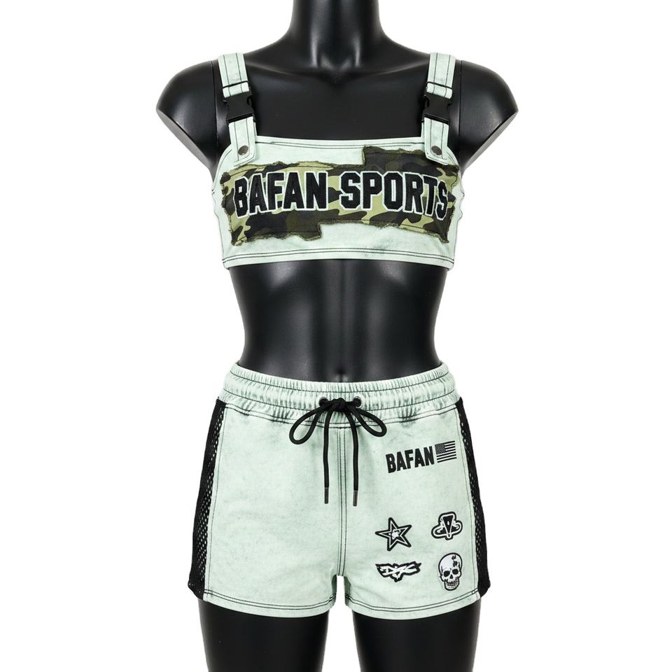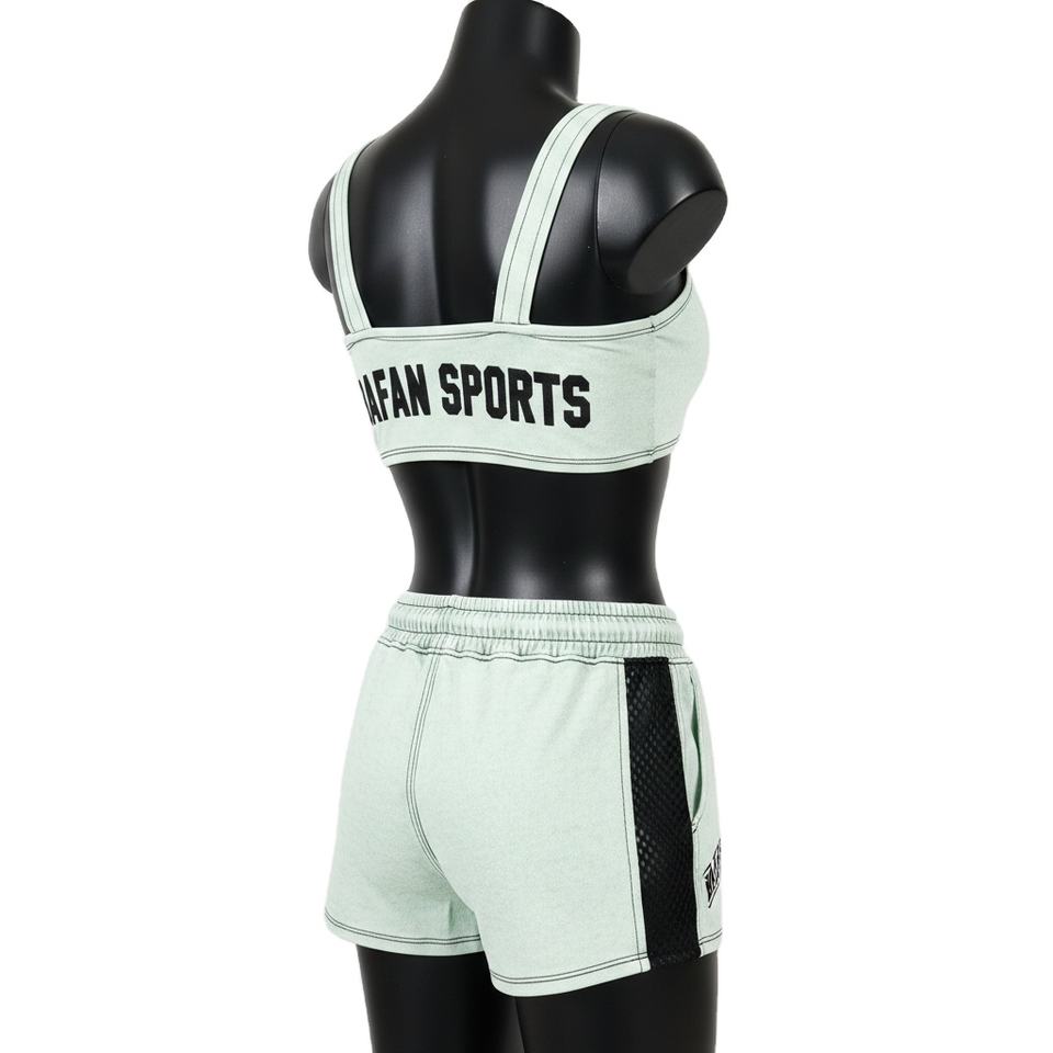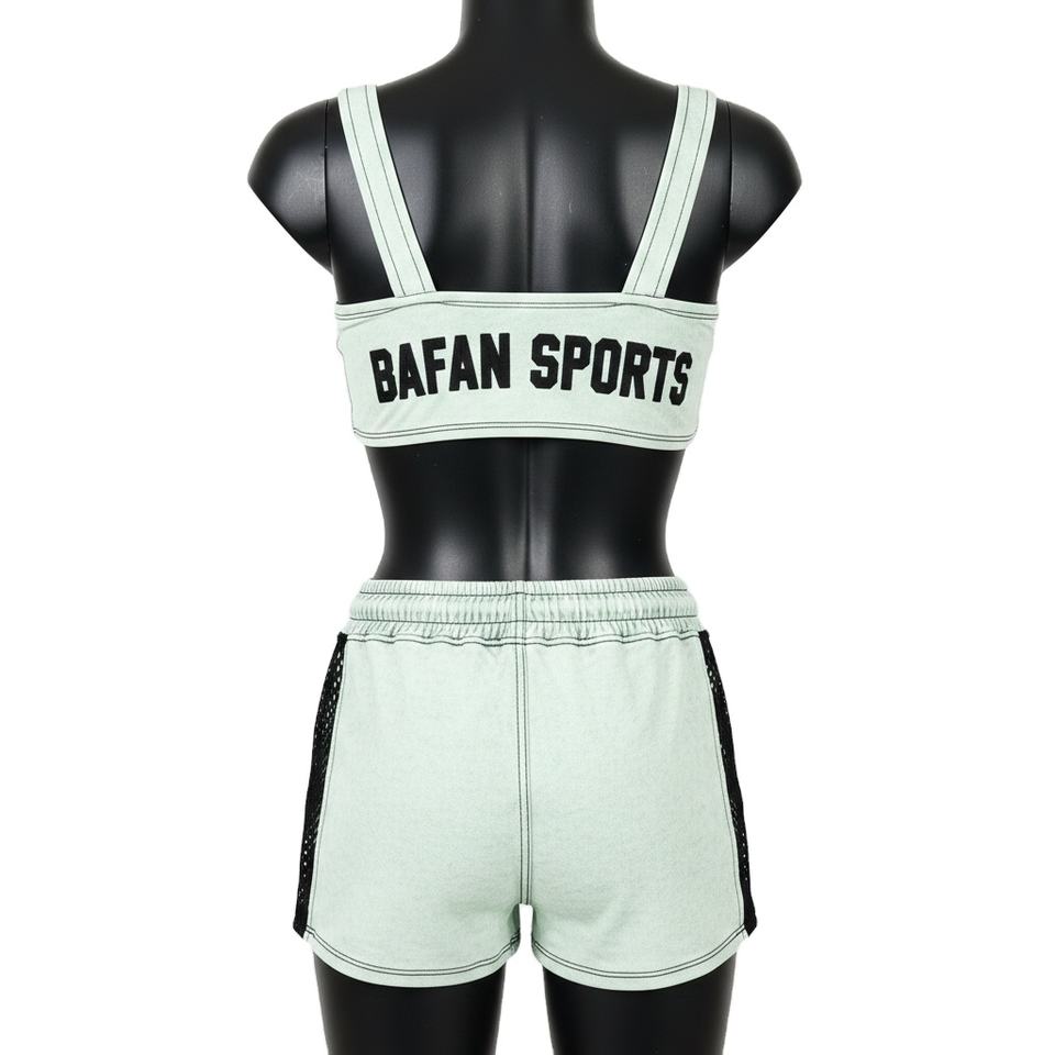 ชุดบิกินี่พรีเมียมสำหรับผู้หญิง ผ้าโพลีเอสเตอร์ผสมสแปนเด็กซ์ ยืดหยุ่นได้ 220 GSM สีมิ้นท์ แต่งผ้าตาข่าย พิมพ์ลายโลโก้