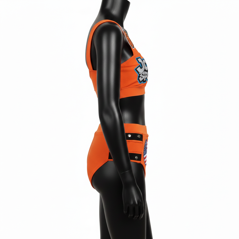 ชุดบิกินี่พรีเมียมสำหรับผู้หญิง 225 GSM ไนลอนผสมสแปนเด็กซ์ สีส้ม แบบสปอร์ต แต่งโลโก้ด้วยเทคนิค Heat Press Applique