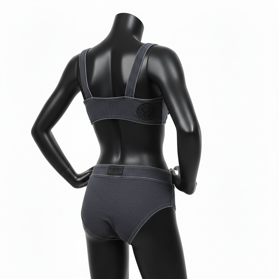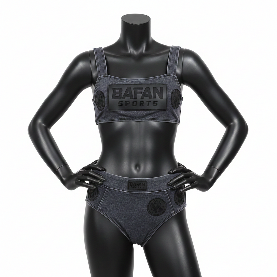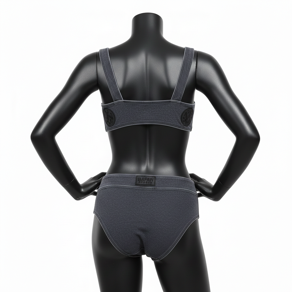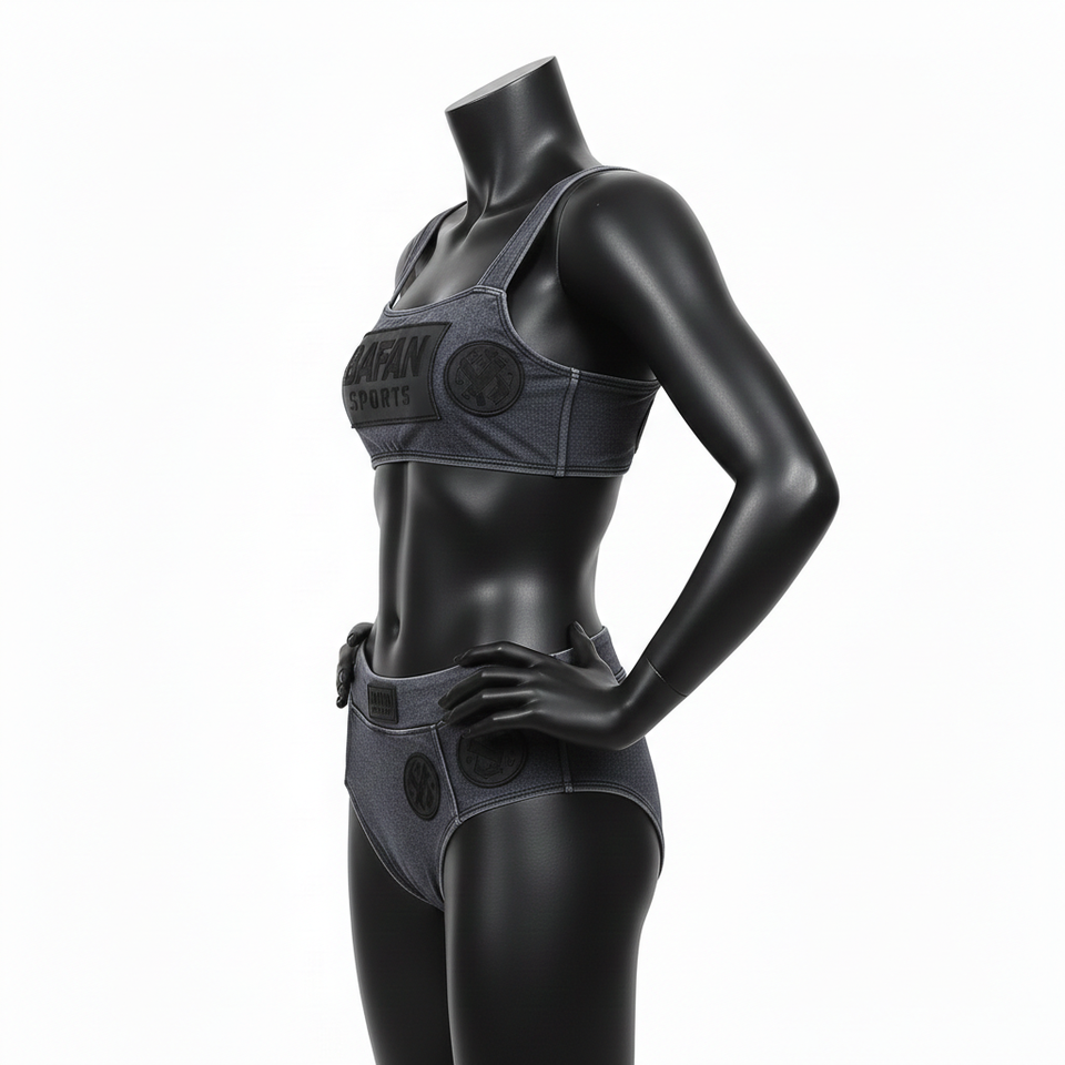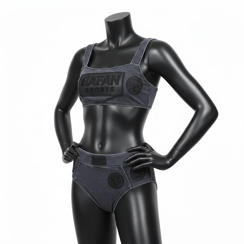 ชุดบิกินี่พรีเมียมสำหรับผู้หญิง ผ้าโพลีเอสเตอร์ผสมสแปนเด็กซ์ GSM สีเทาเข้ม แต่งสีดำแบบแผง โลโก้ปะยาง ชุดบิกินี่ผู้หญิงแบบสั่งทำ