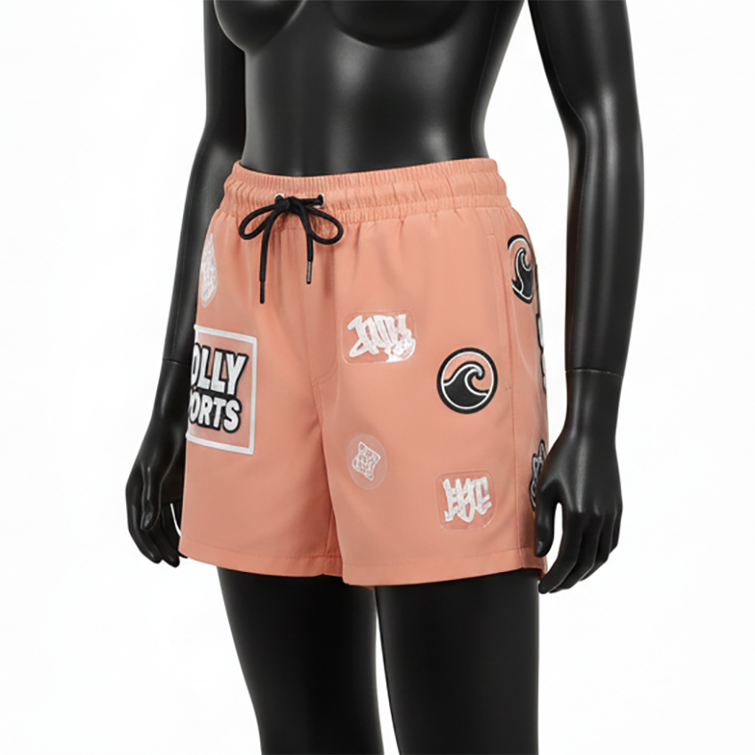 กางเกงว่ายน้ำผู้หญิงพรีเมียม แห้งเร็ว ผลิตจากโพลีเอสเตอร์ไมโครไฟเบอร์ 120 GSM สีพีชนุ่ม พร้อมโลโก้แบบรีดร้อน