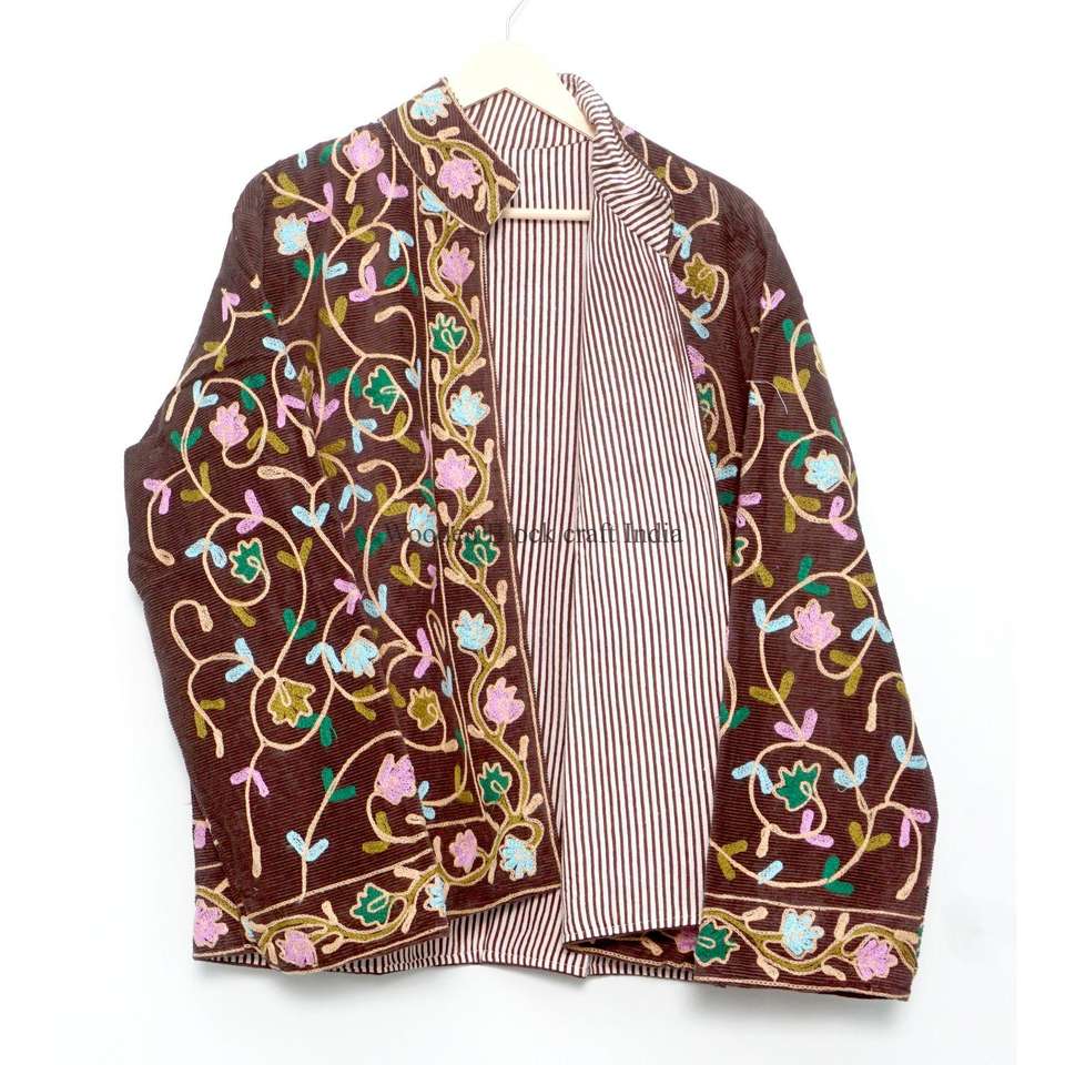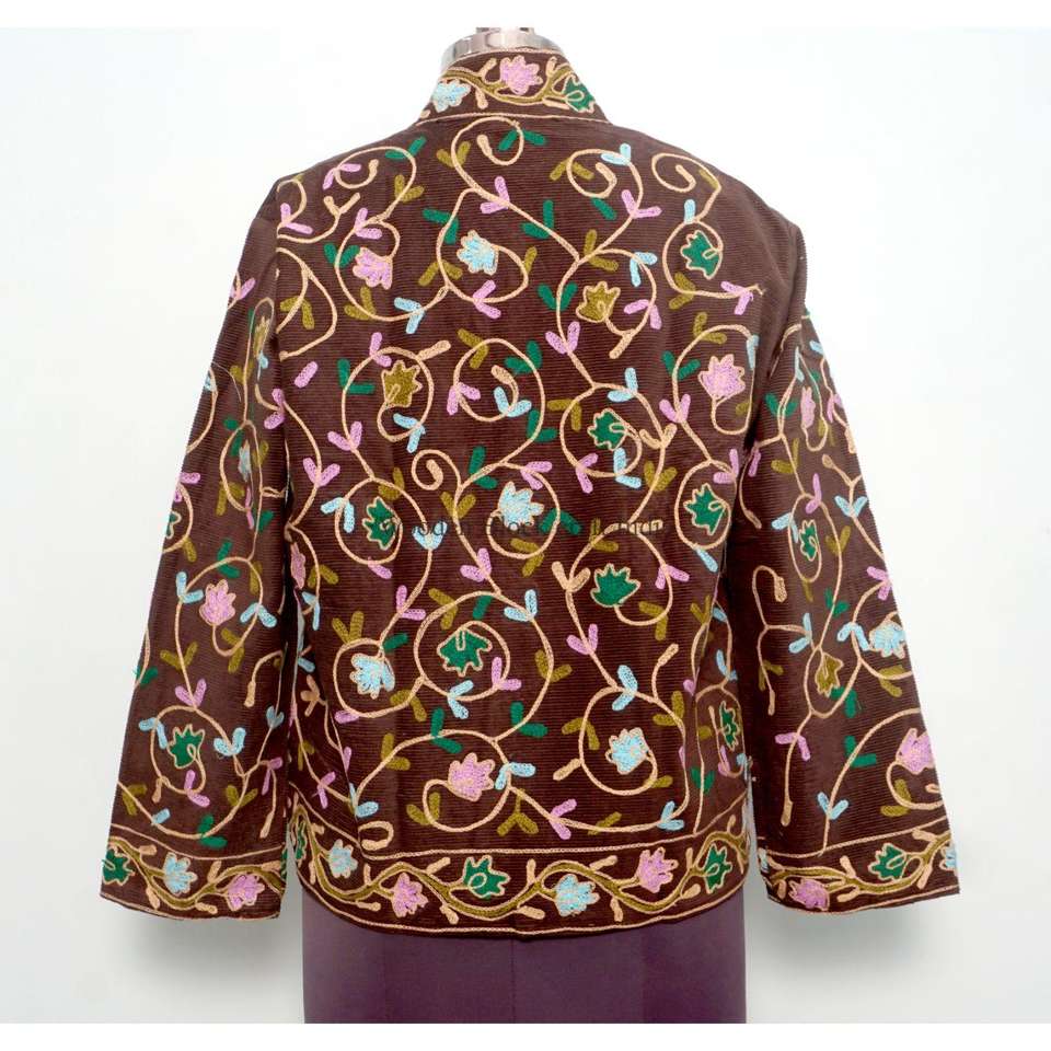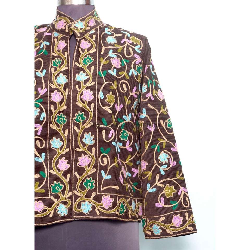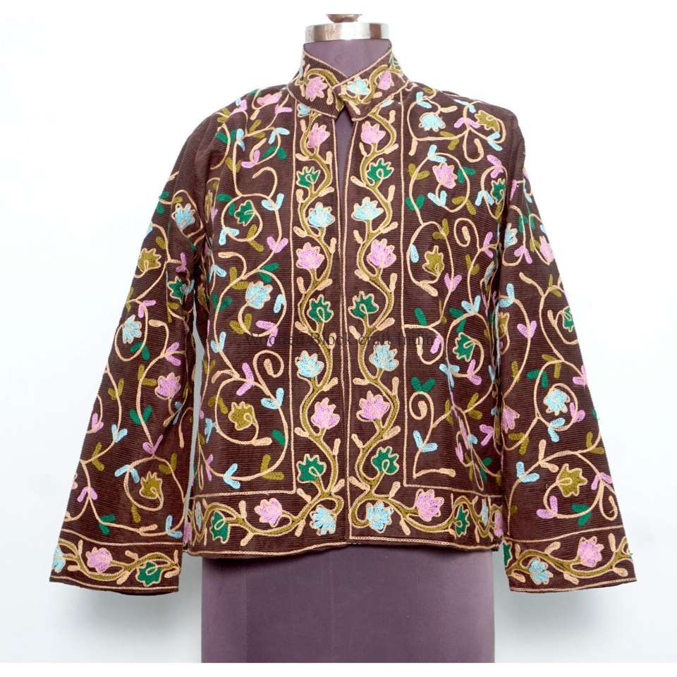 เสื้อแจ็คเก็ตฤดูหนาวสไตล์โบฮีเมียนสำหรับผู้หญิง งานฝีมือปักลายดอกไม้ ผ้าเนื้อนุ่มสีครีม งานเย็บปักถักร้อยหลากสีสันลายดอกไม้
